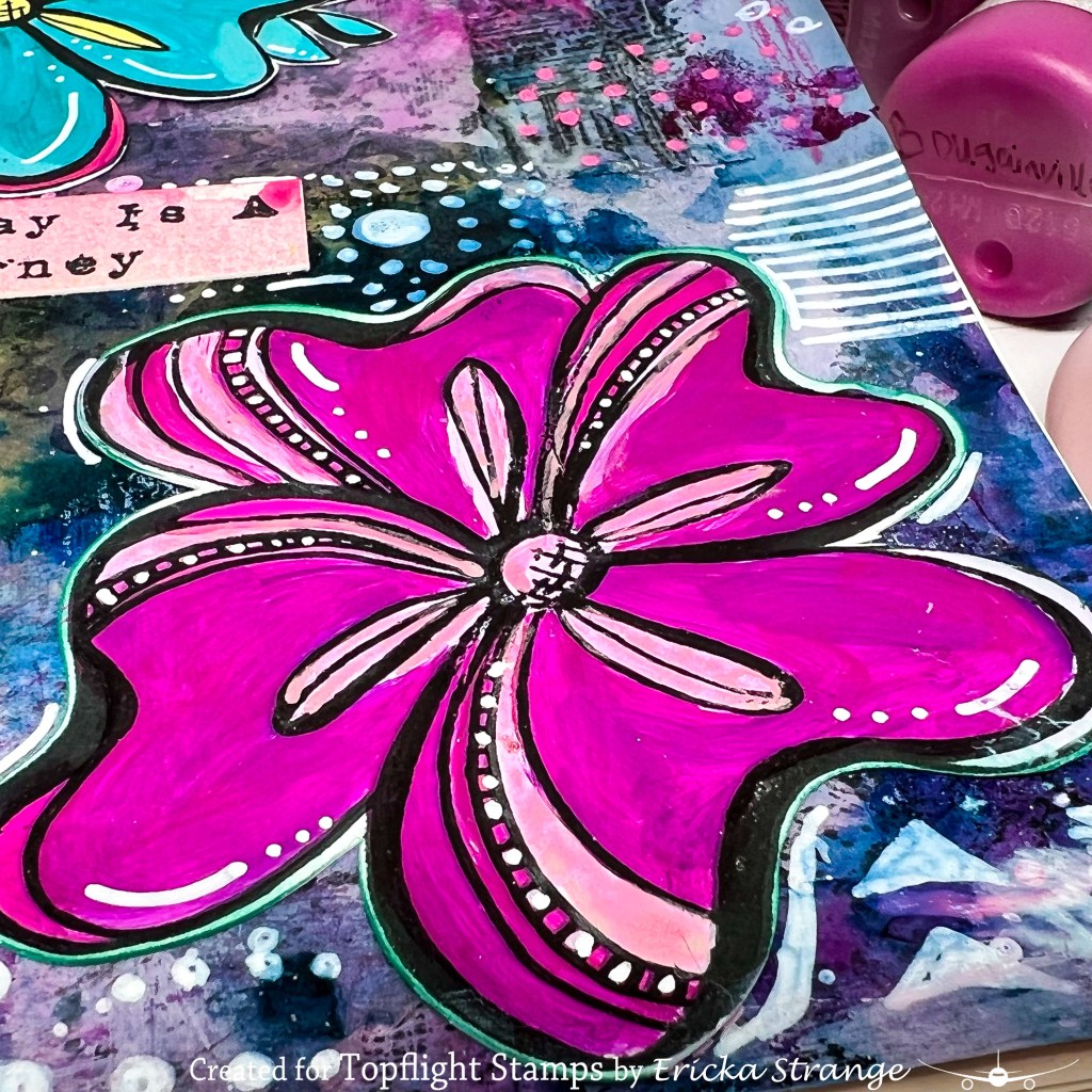 As you can see, my piece got dark rather quickly. I added some flowers from the JOFY 112 set that I had previously painted and then added some more Bougainvillea along with some white gel pen to lighten up my background.