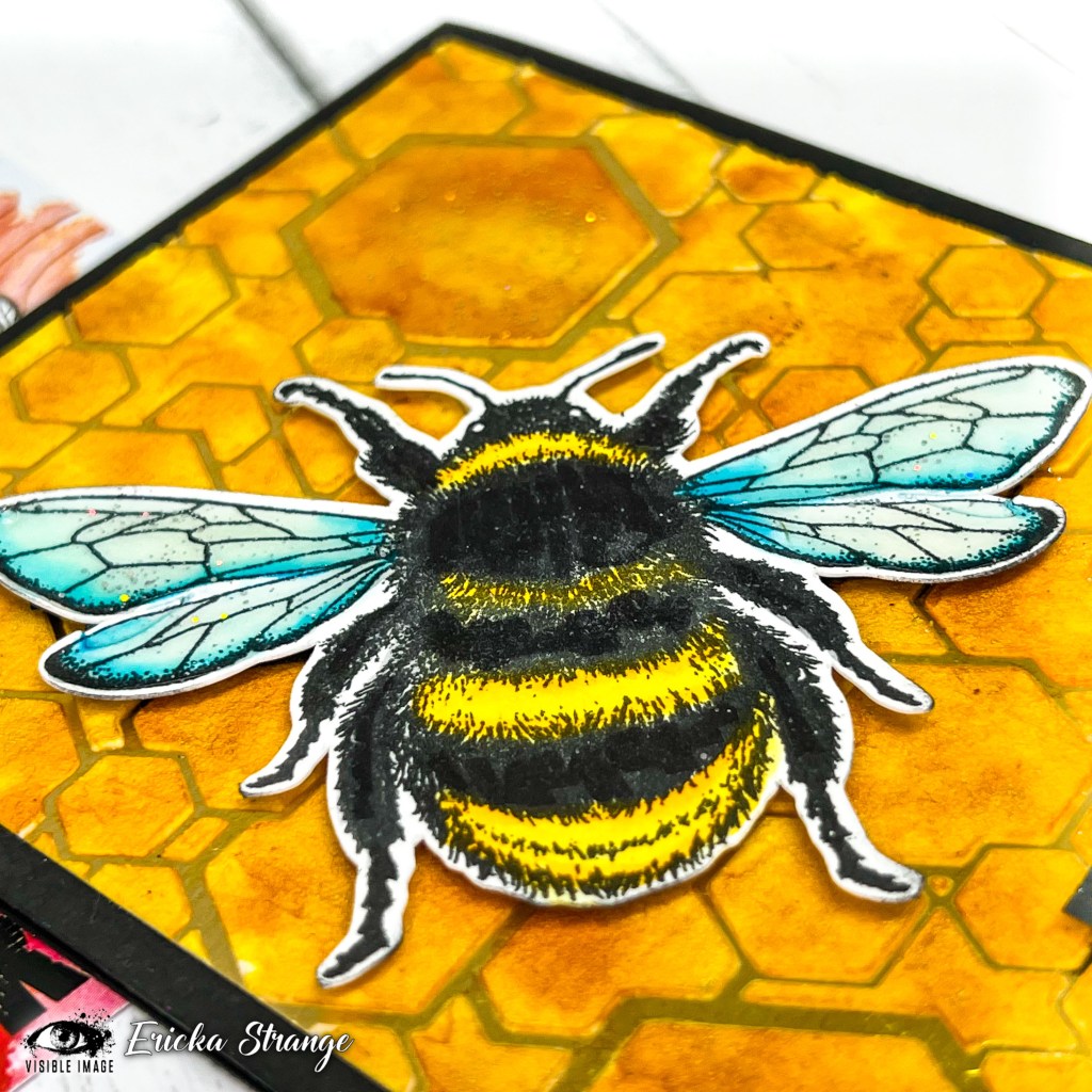 I hope you are all doing well and are having a great summer. Today I’m playing with the Visible Image Bee Happy stamp set along with the Honeycomb Hex stencil.
