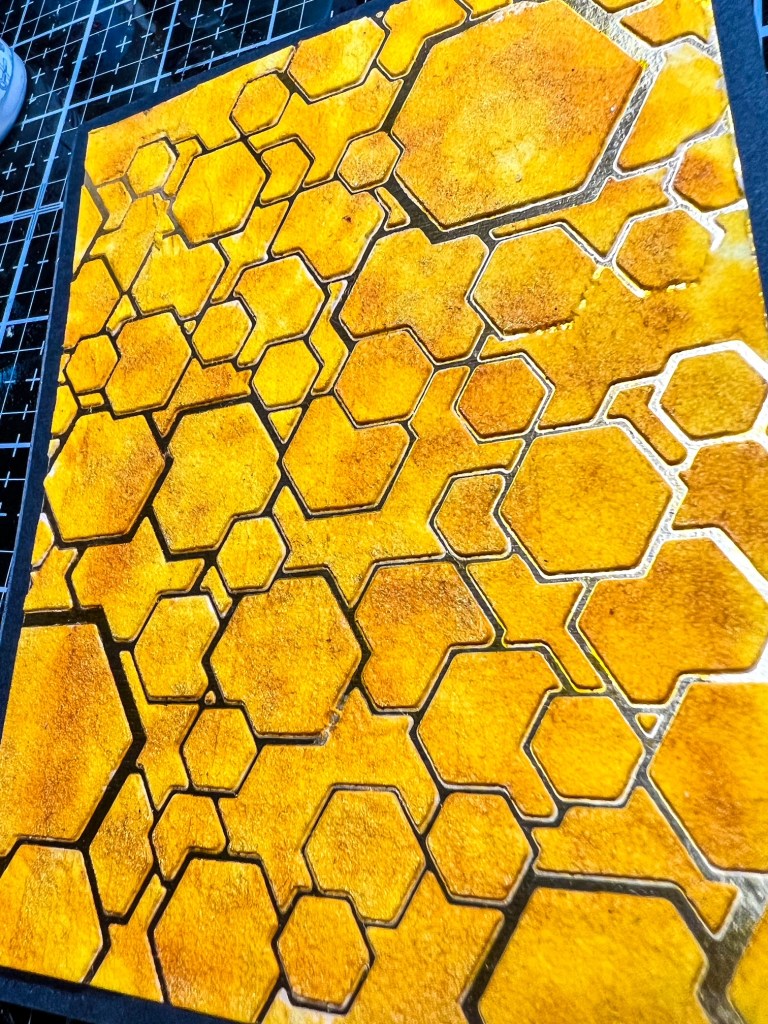I thought it would bee (lol) fun to try the Hex stencil on gold cardstock with texture paste. Once the paste was dry, I used honeycomb alcohol ink with a bending tool and applied it to the paste to turn it yellow.