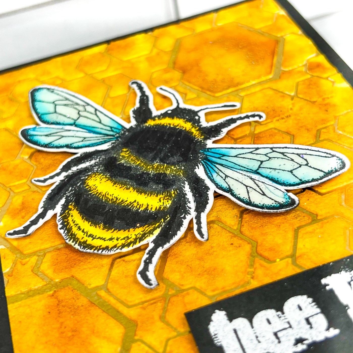 I hope you are all doing well and are having a great summer. Today I’m playing with the Visible Image Bee Happy stamp set along with the Honeycomb Hex stencil.