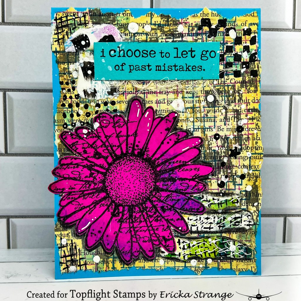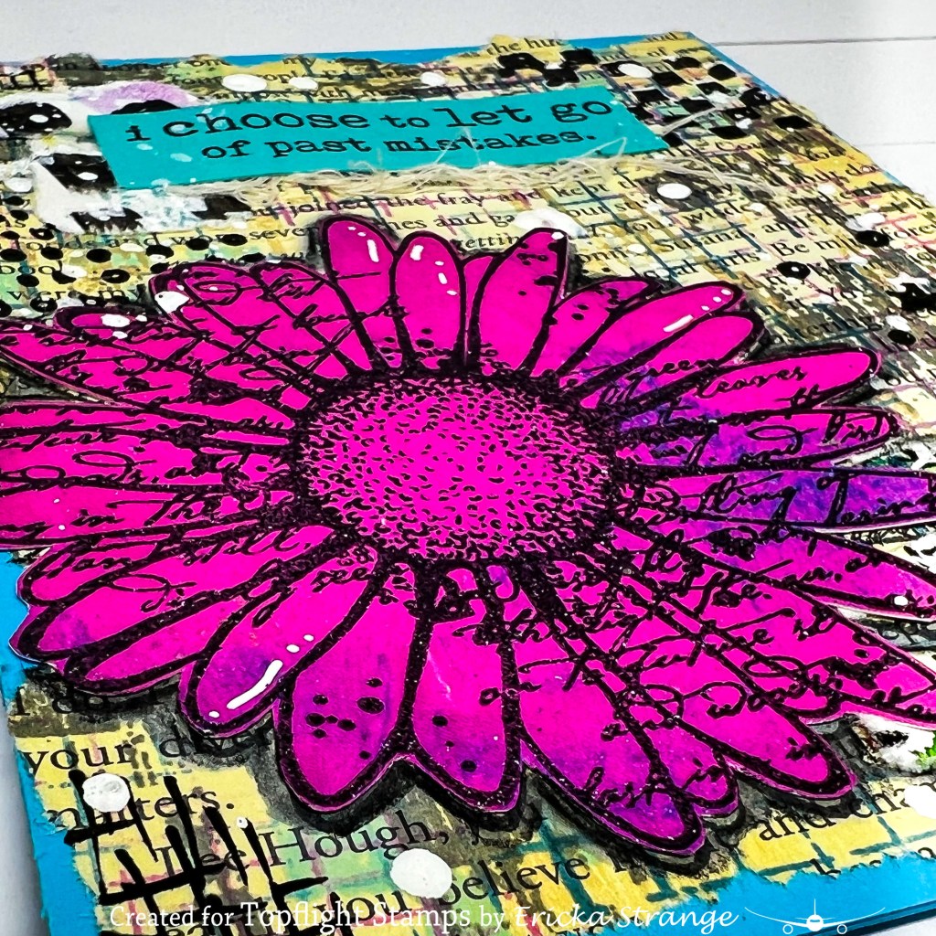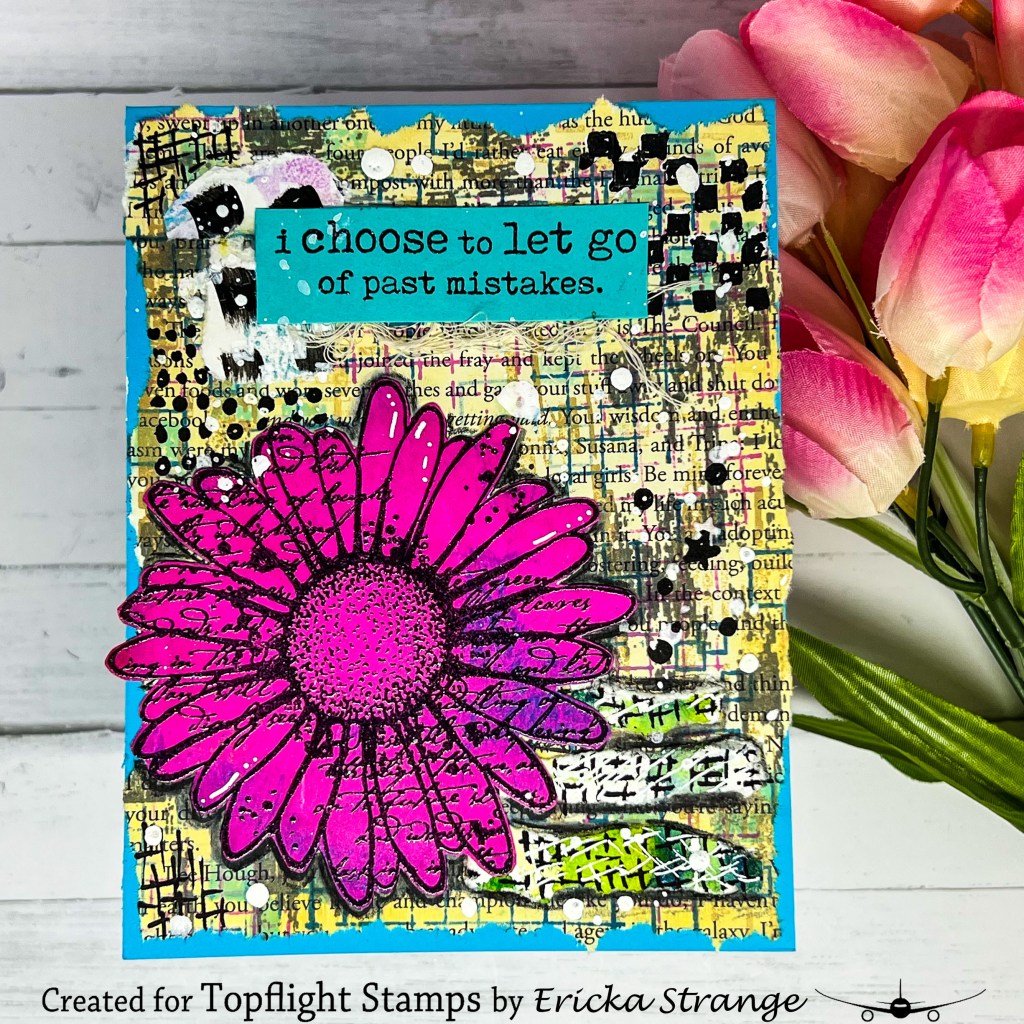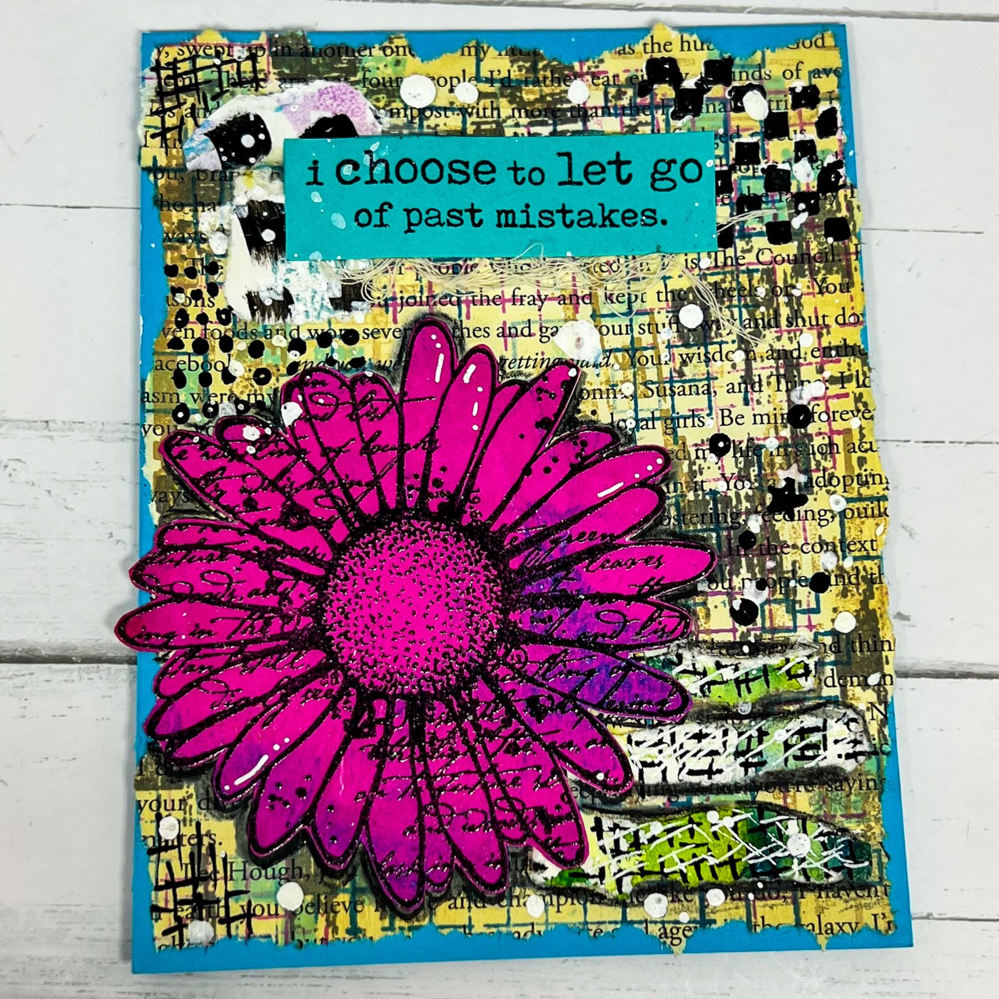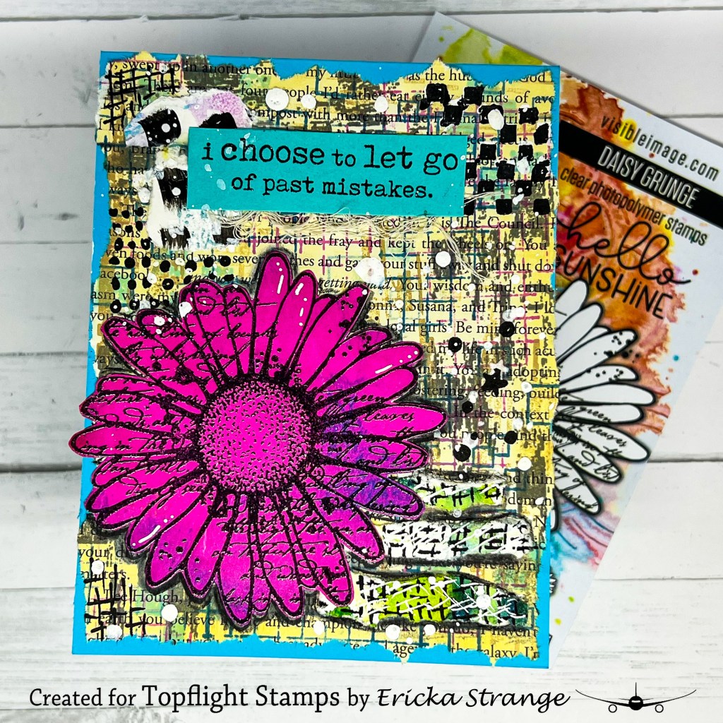 I started by stamping the Visible Image Daisy Grunge on a gel press paper I had in my stash. I clear heat embossed the flower and cut it out. I then started working on my background.
