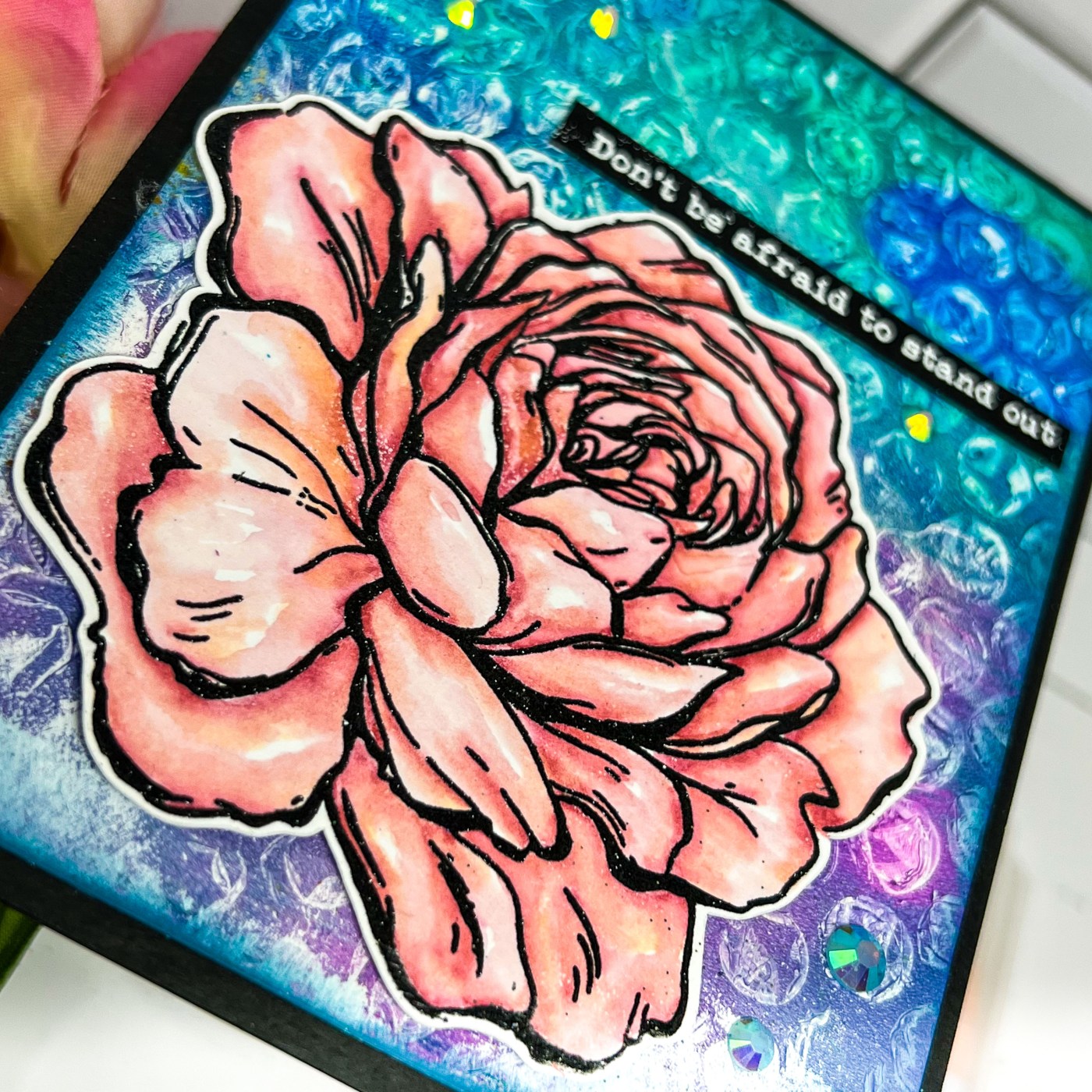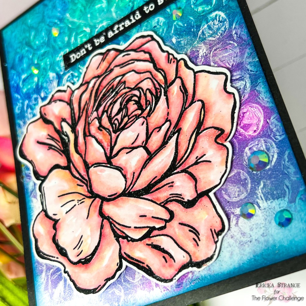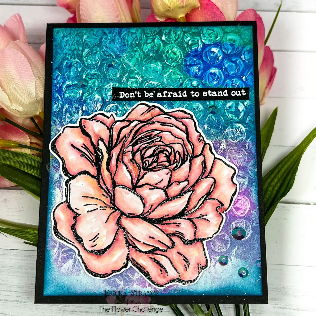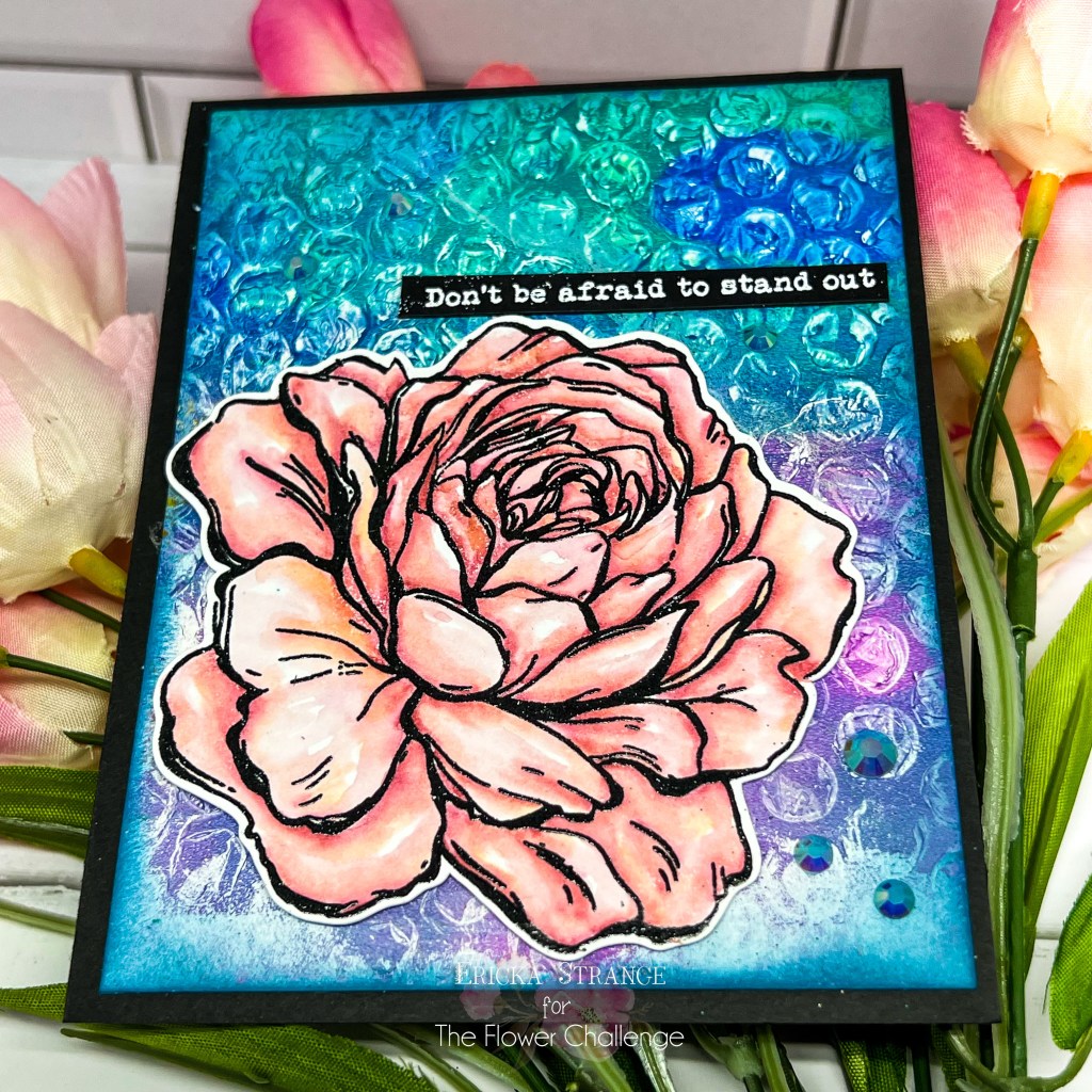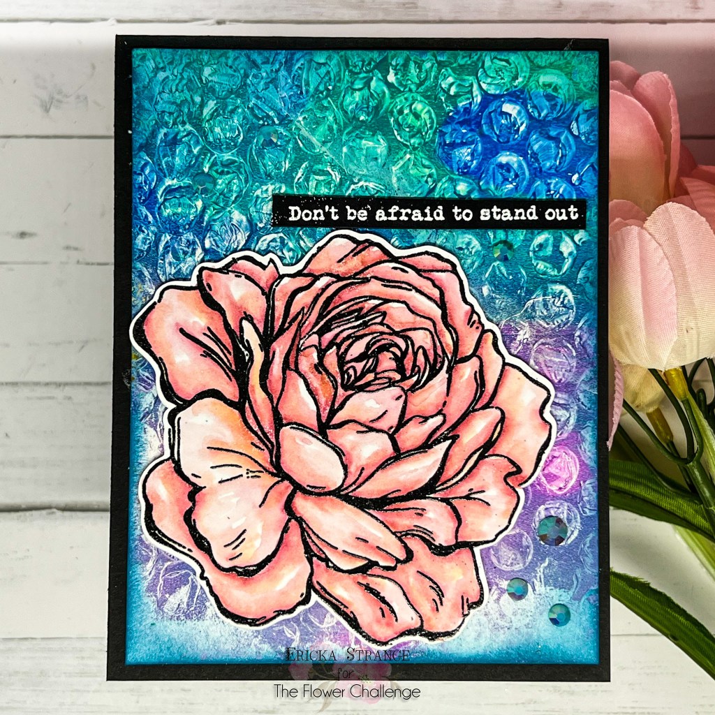 I recognized the bubble wrap right away, Ericka, and I love how that background turned out. You did a beautiful job of coloring the rose with Zigs. It’s gorgeous.
