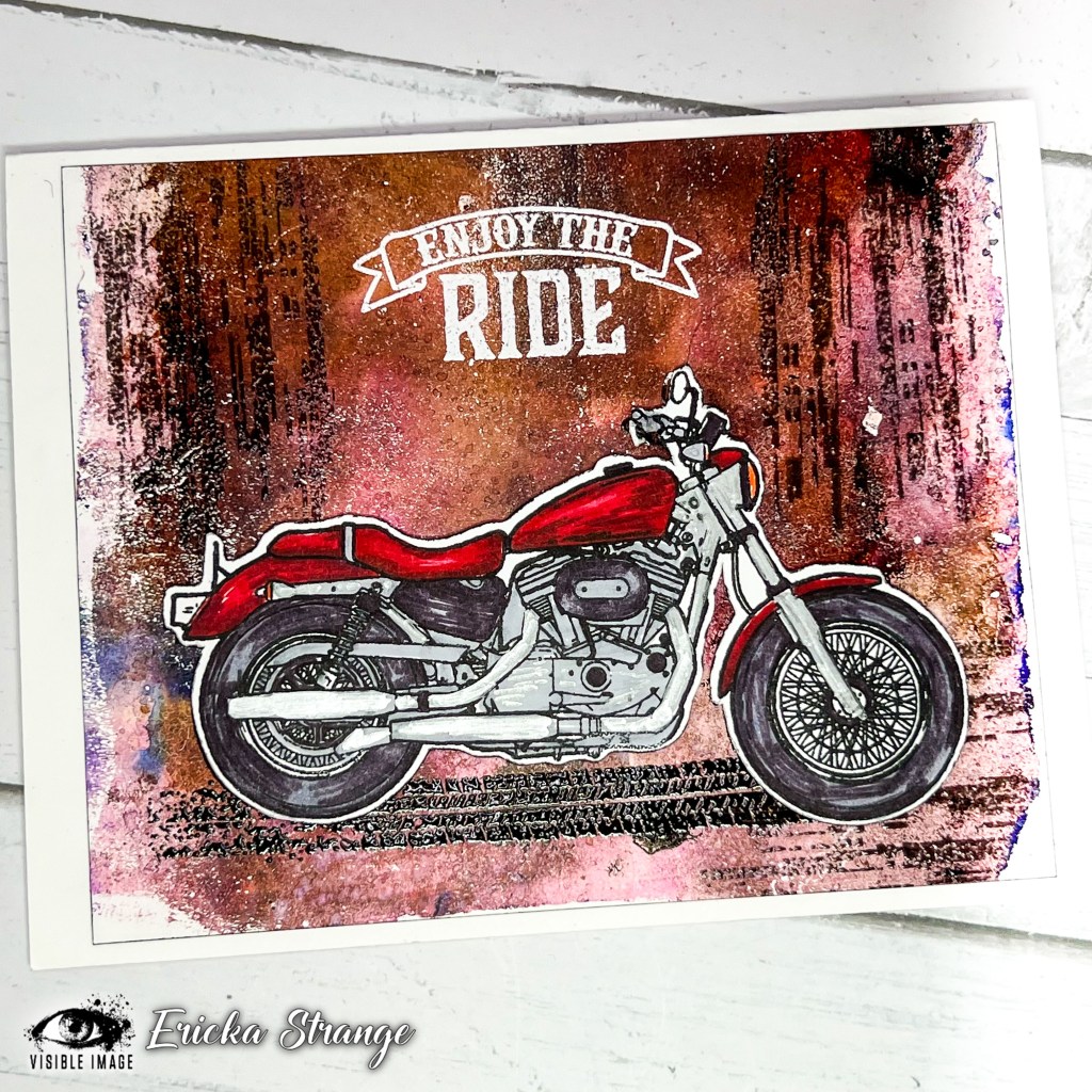 Hello friends and happy August! Today I’m creating a masculine card using alcohol inks on a gel press along with the Visible Image Ride the Wind stamp set. The details on these motorcycles are awesome and it was so easy to stamp.