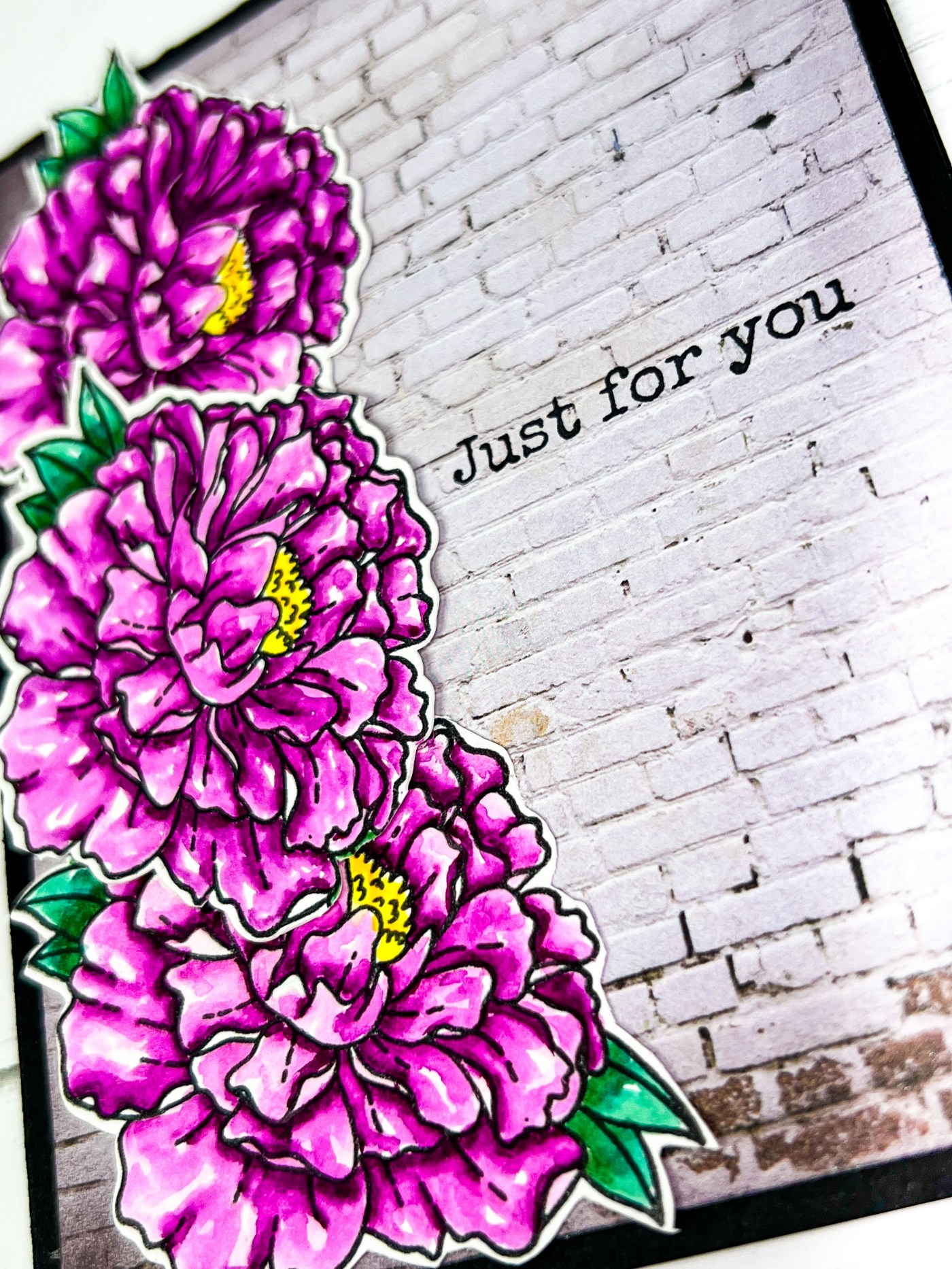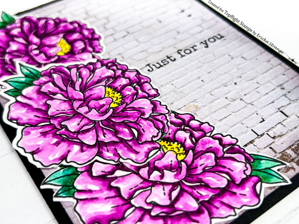 I started by stamping the peony three times on Bristol Smooth paper and used some watercolor markers to color them up. I fussy cut the flowers out and then used this pretty brick paper from the Craft Consortium 6×6 Paper pad.