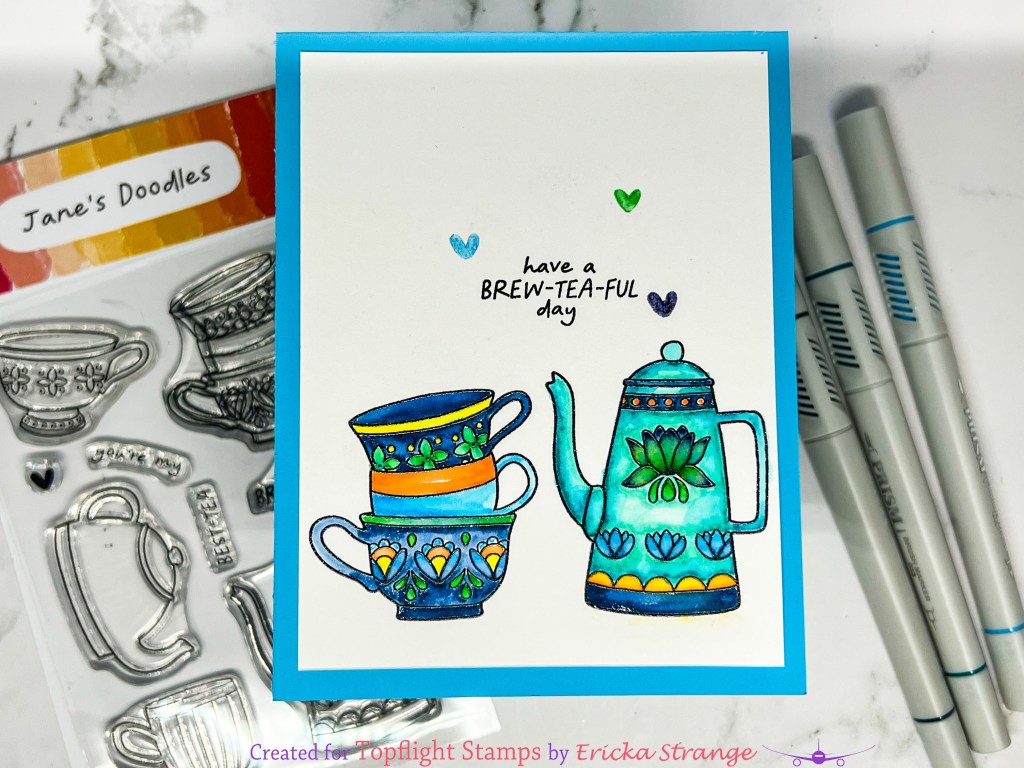 Hello friends today I am over on the Topflight Stamps blog playing with the Jane’s Doodles Brew-Tea-Ful set for a fun little tea card. I love this set and it pretty coffee cups that you can color up.