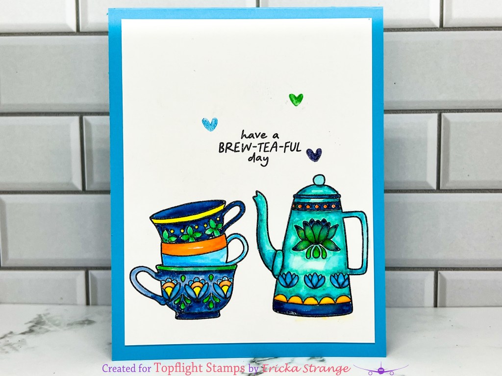 I stamped these on Bristol Smooth card stock and clear heat embossed them. I then took my Prism Brush Markers in Blue Lagoon and colored up my tea pot and cups.