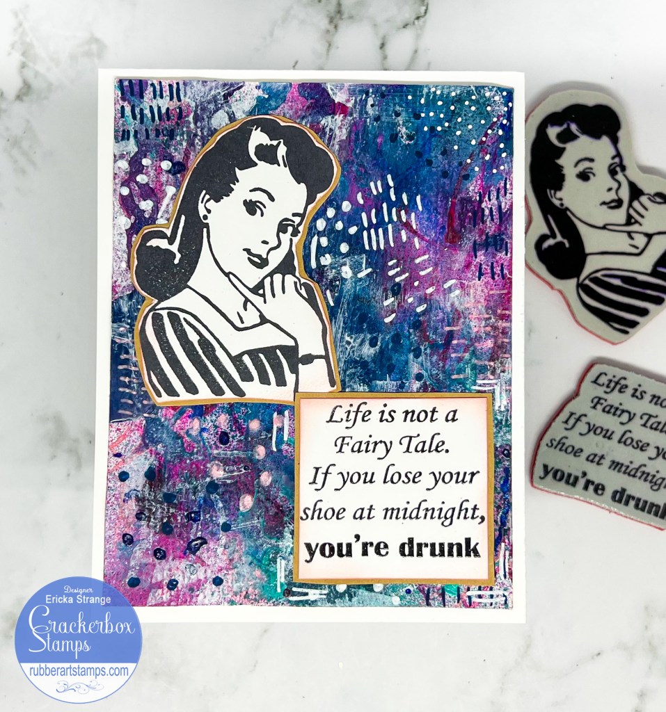 Hello crafty friends! Today I’m playing with the fun and snarky Crackerbox Stamps sentiment You’re Drunk and a mixed media background.