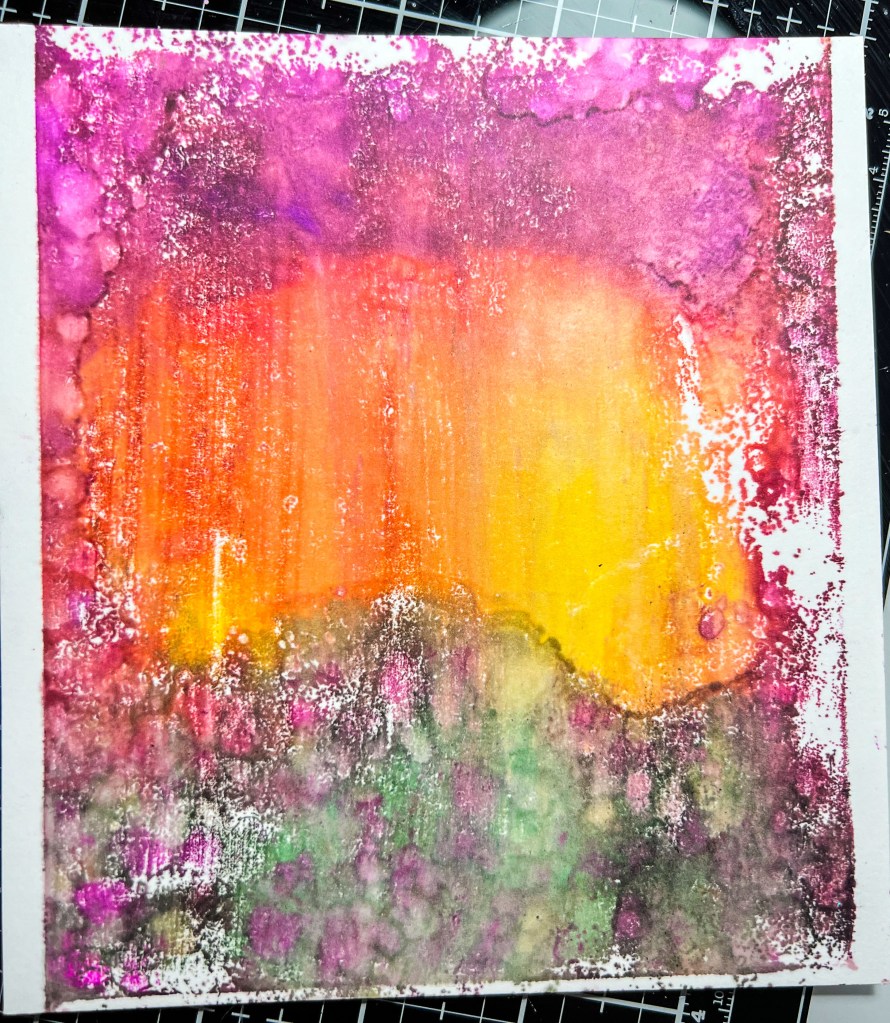 I started off with an alcohol ink background on Yupo I made using the Bearly Arts new Alcohol Ink set. I then used a technique I saw from Tracy Dutton using Ranger Alcohol Lift Ink with a brayer applied to the Yupo to lift the ink onto cardstock. I love playing with this technique and the beautiful pulls you get on cardstock.