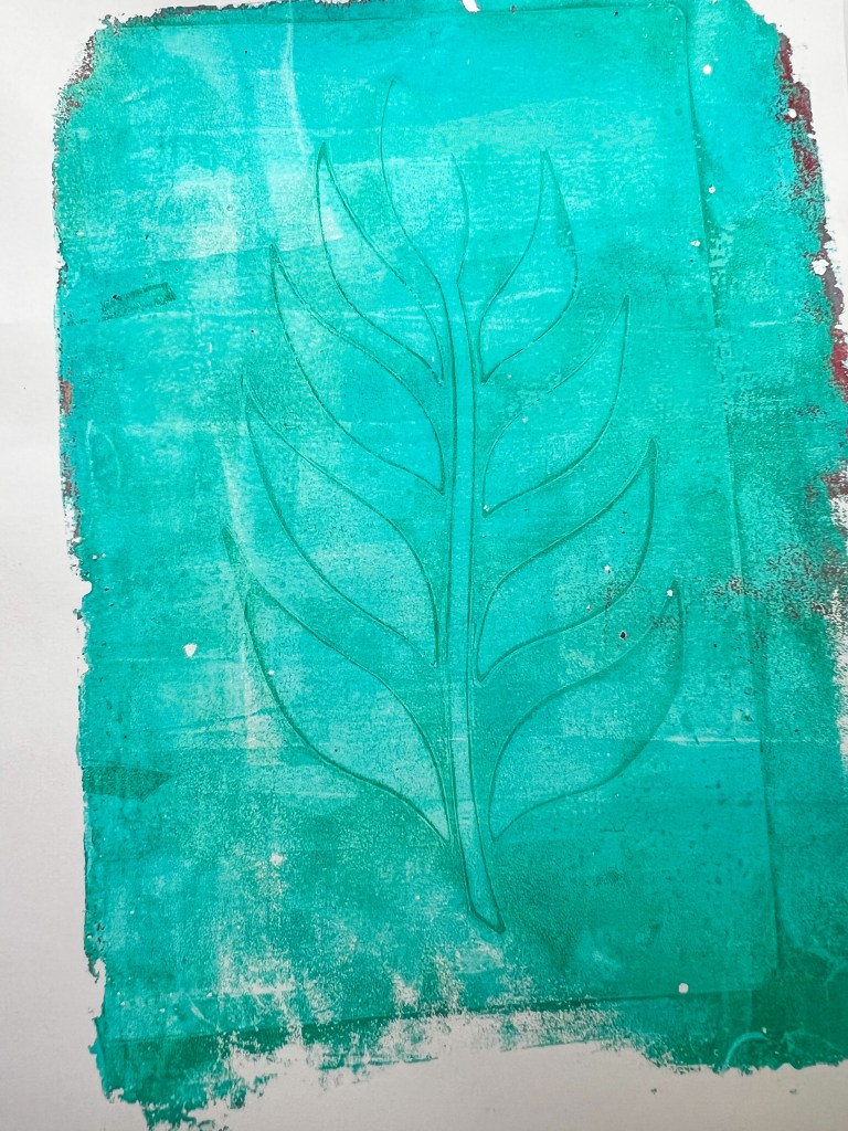 I started by applying PaperArtsy Fresco paints in Gumboots on my gel press and used the PaperArtsy Tracy Scott PS226 stencil to the gel press. I pulled the print up and then applied Beach Hut paint to the gel press. I used another paper to pull the left over print and made this pretty print with a shadow of the leaf.