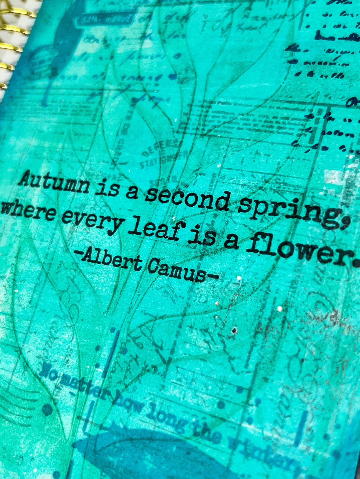 I then used the PaperArtsy Sara Naumann 36 along with Versafine Clair ink in Morning Mist, Twilight, and Warm Breeze. I love the mixture of script and leaves in this set.