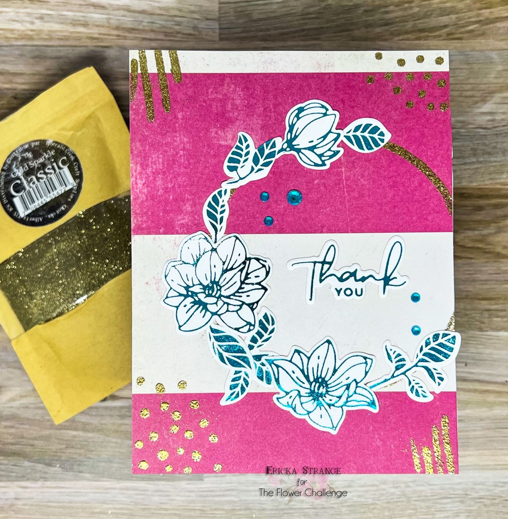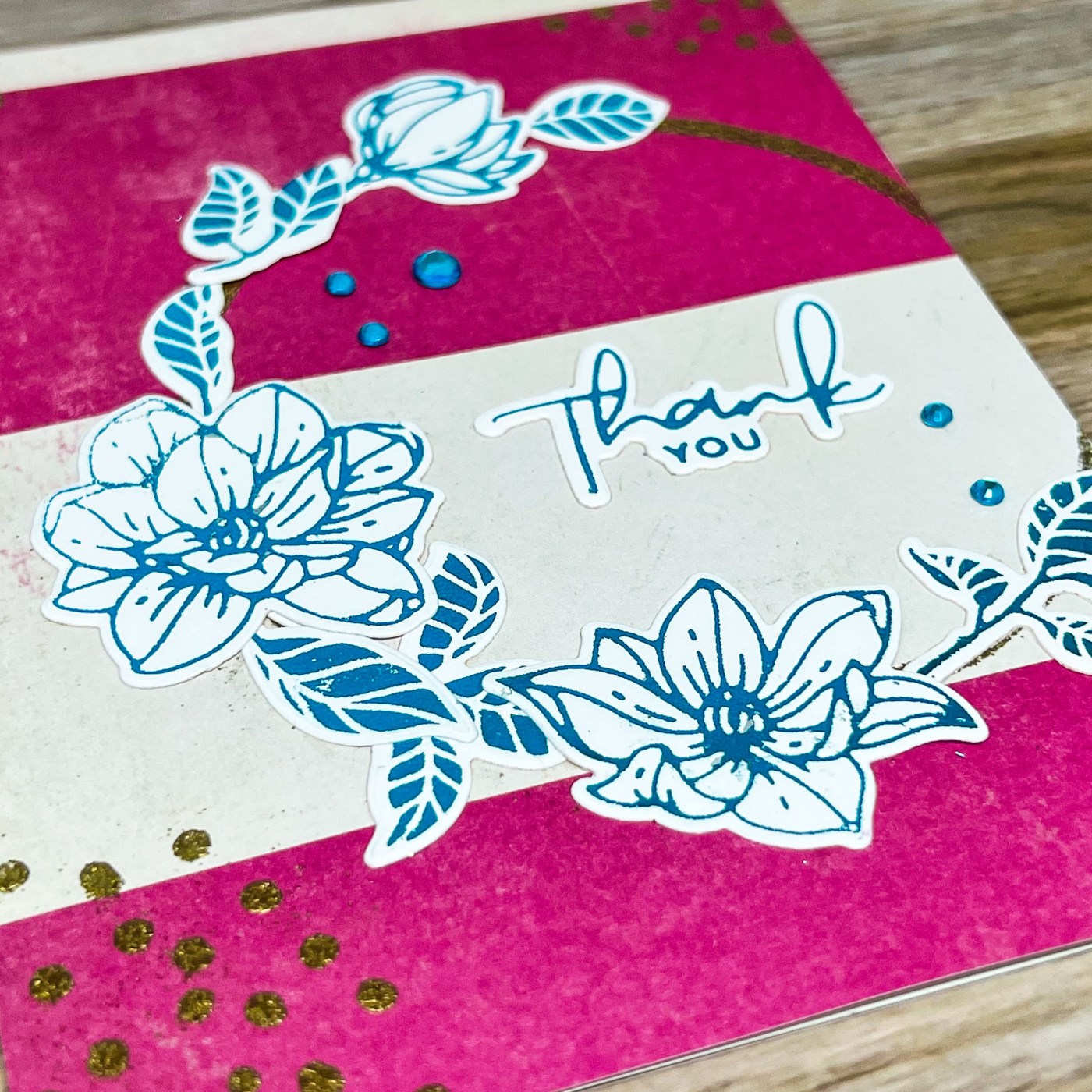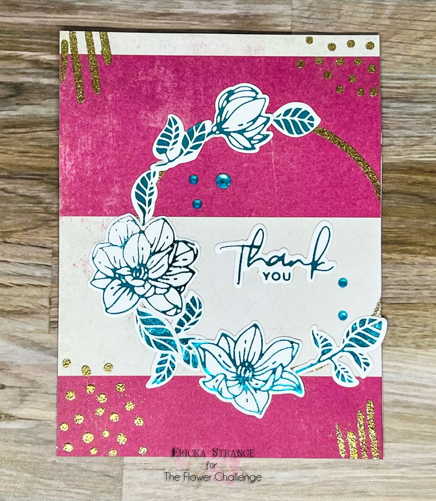 The contrast between hot pink background and teal floral wreath is fabulous! Love the added golden touches as well!