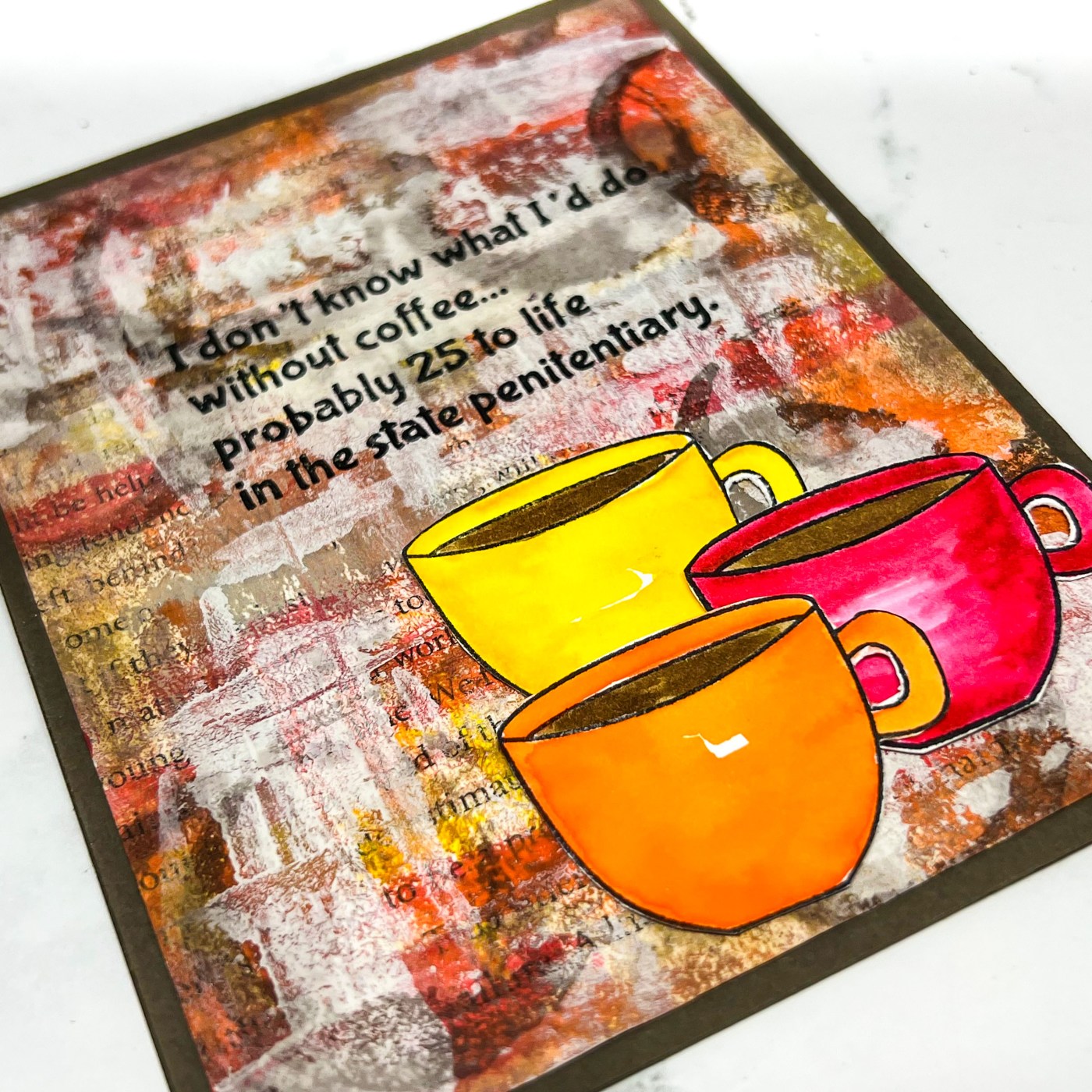 I fussy cut the cups out and attached them to my background with foam tape. I thought that the I Don’t Know Without Coffee stamp would go perfectly with grungy background.