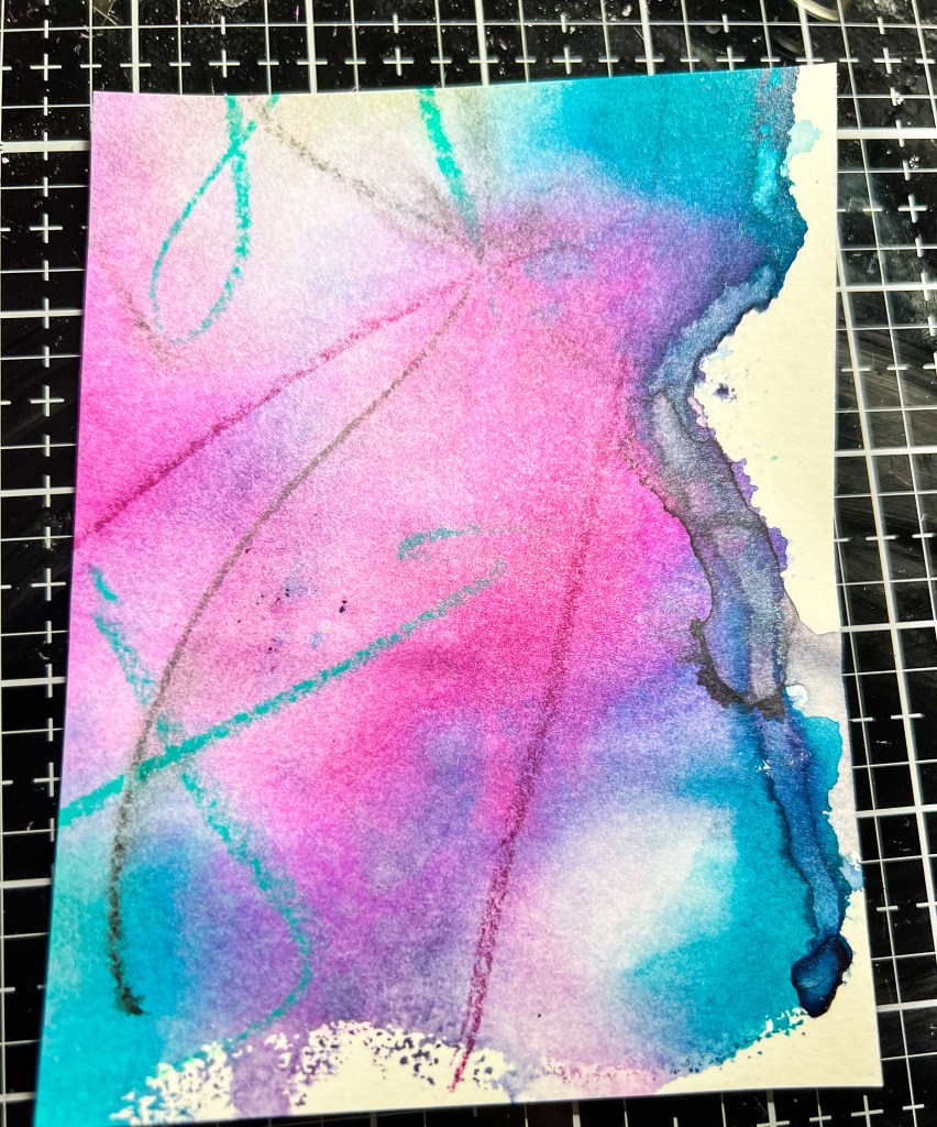 I started with a background I had created using Lavinia Acrylic Sprays in Teal, Claret, and Midnight Blue. Once my background was dry, I used some Stabilo pencils to make random marks.