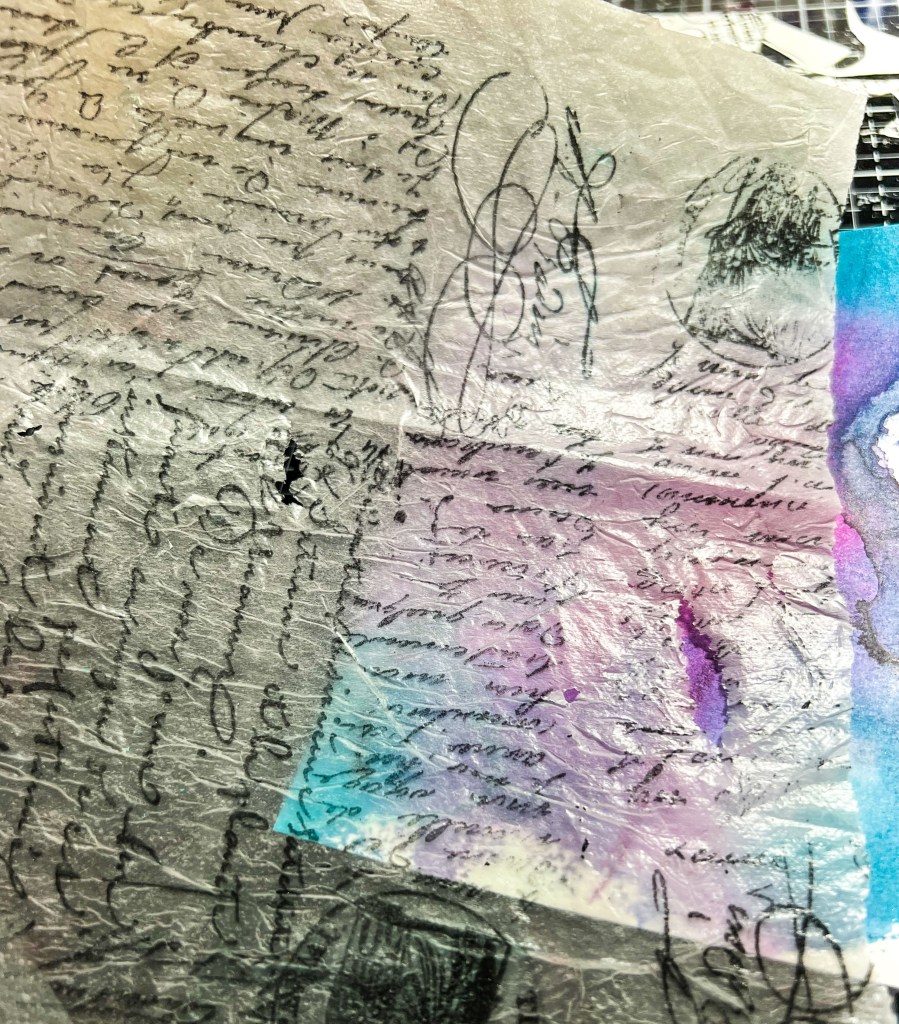 I then used some tissue paper I had previously stamped with the Katzelkraft Big Script and sealed with Liquitex Matte Medium and attached it to my card base.