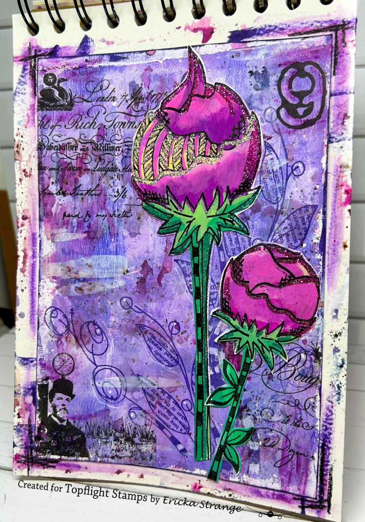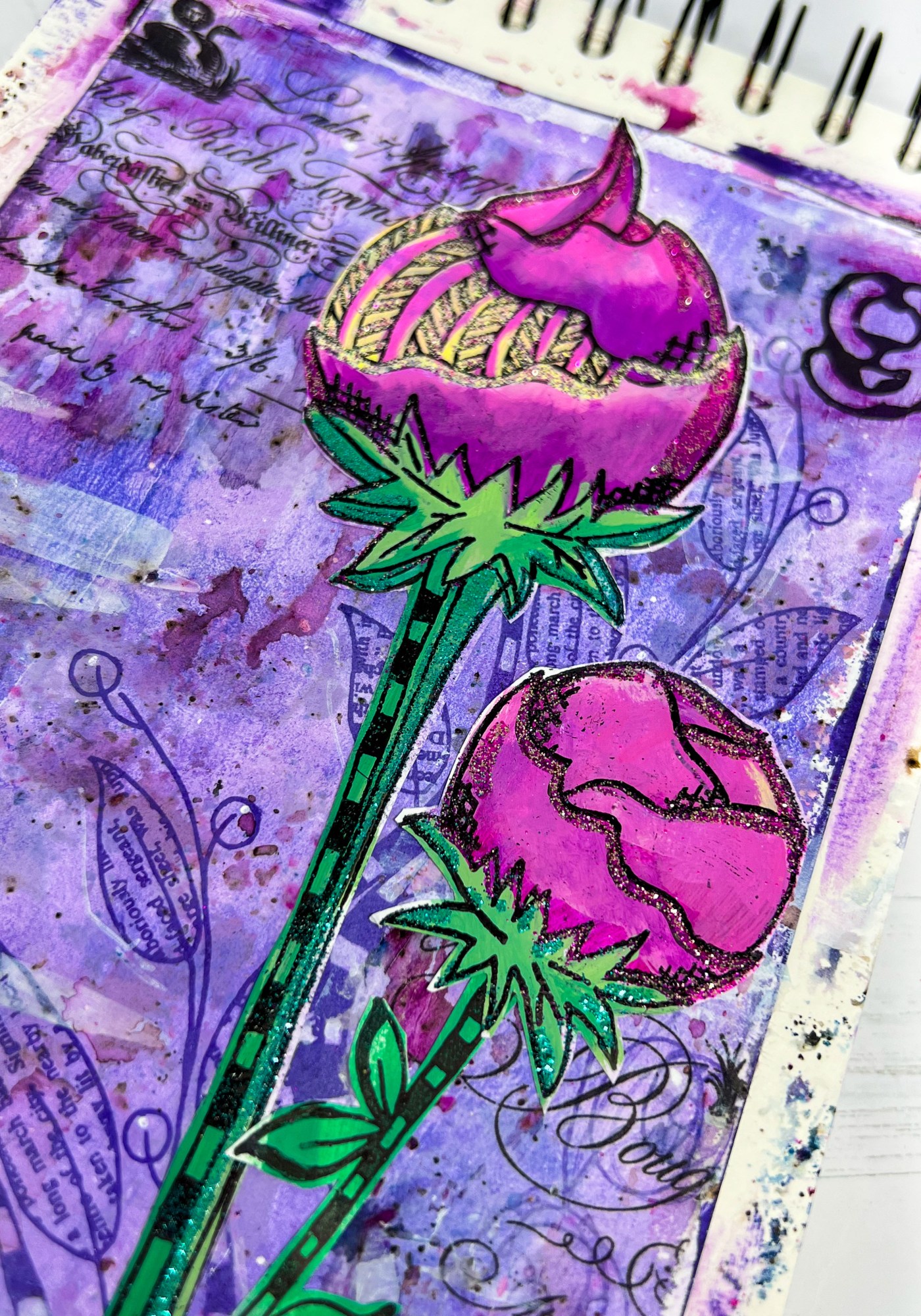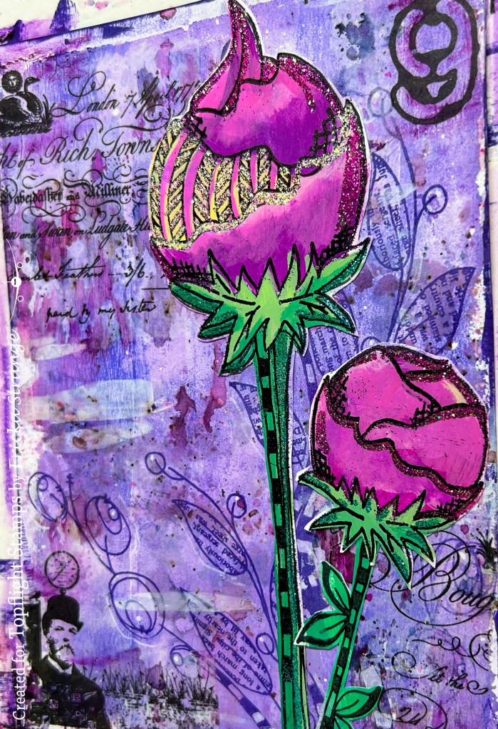 I then used one of the prints as and stamped the flowers from the same PaperArtsy set and painted them up with Toffee Apple, Bougainvillea, Bubble Gum, Pistachio, Green Patina, and Lemon Meringue.