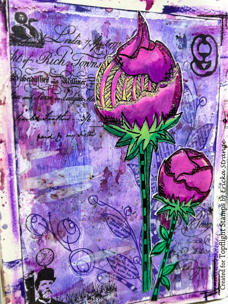 I started out the Fresco Paints in Moon Light, Globe Thistle, and Eggplant and add them to my gel press to pull up several prints. I picked this background and then stamped one of the images from PaperArtsy JOFY 94 in Versafine Clair Fantasia.