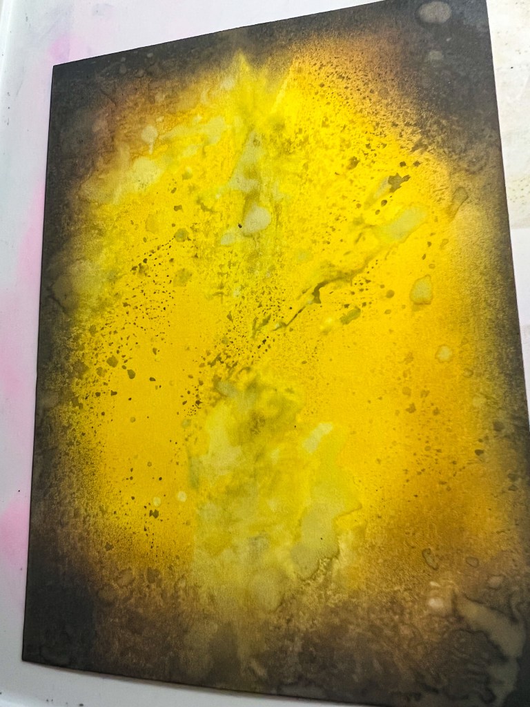 I started with some distress oxide ink blending in Squeezed Lemonade, Mustard Seed, and Black Soot on Bristol smooth paper. I then lightly spritzed the paper and lifted of some of the ink.