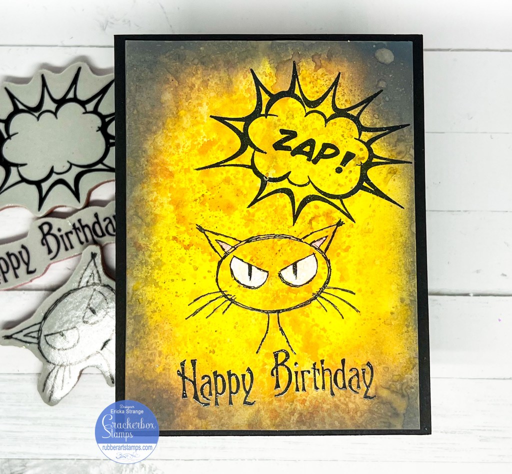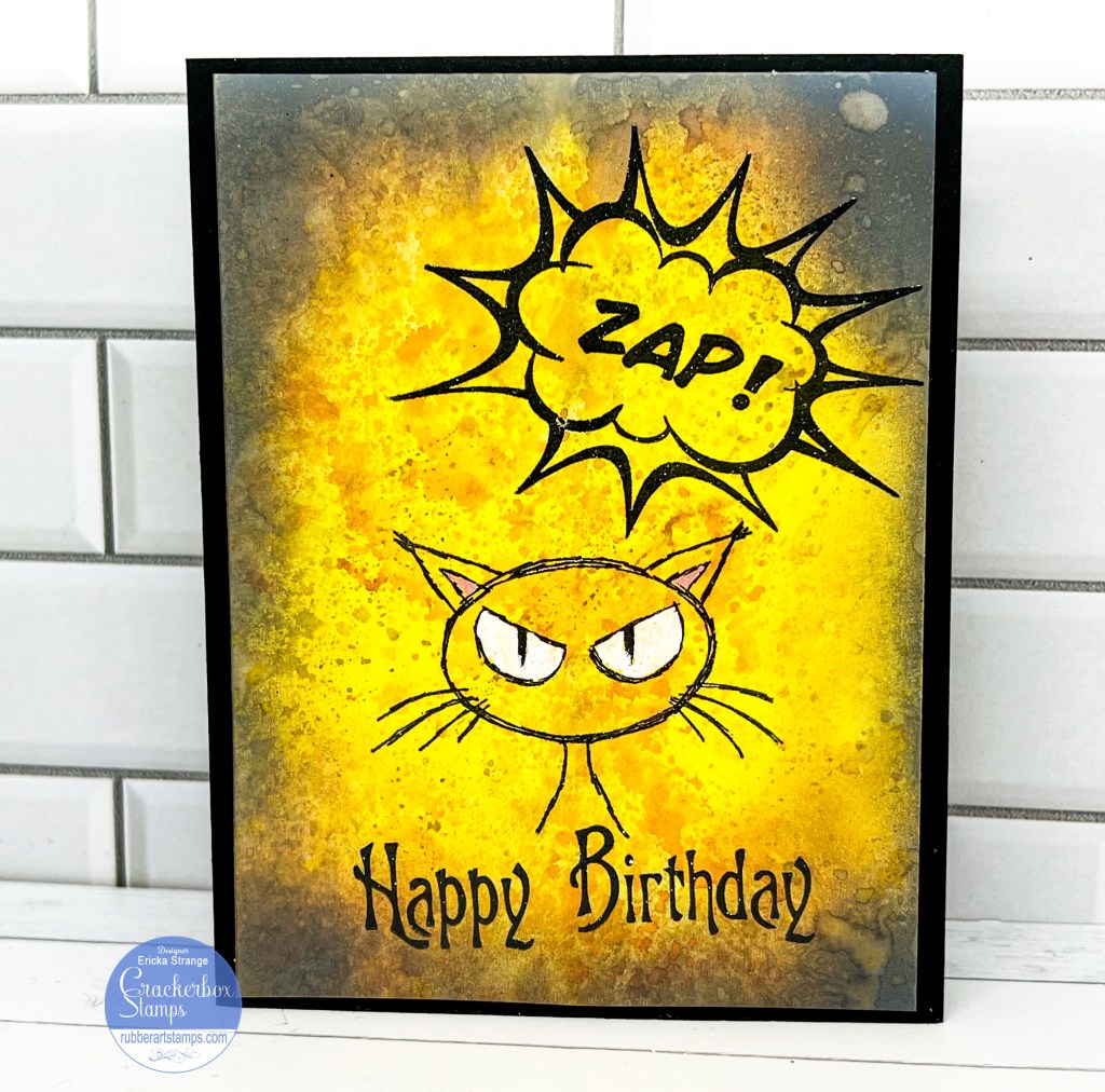 When the background was dry, I used the Cat Sketchy stamp along with the Birthday 11 sentiment and a coming soon speech bubble with the word zap and stamp and clear embossed them.