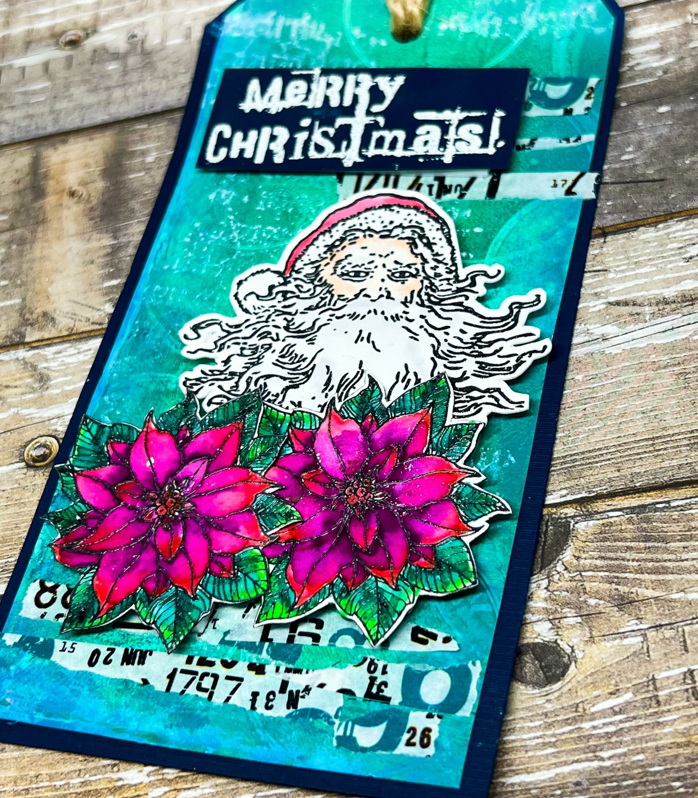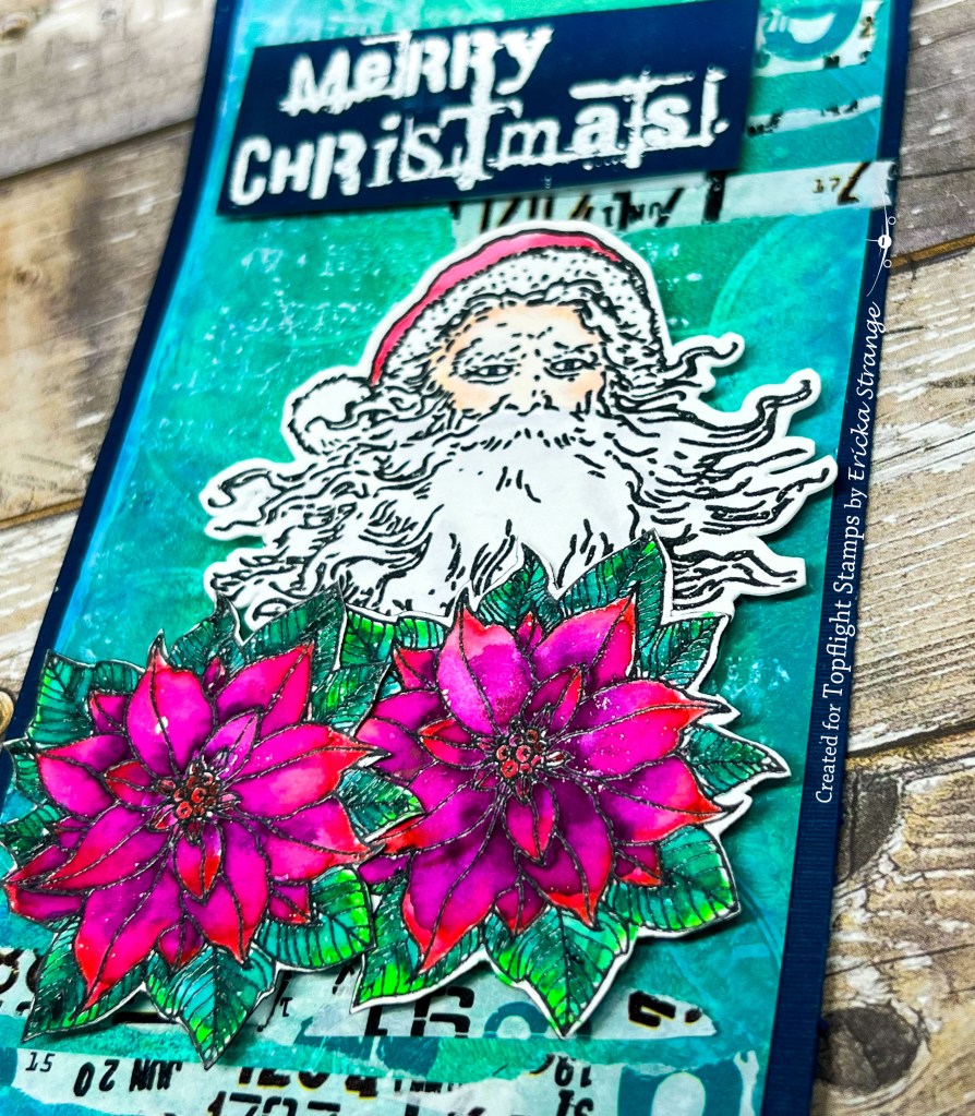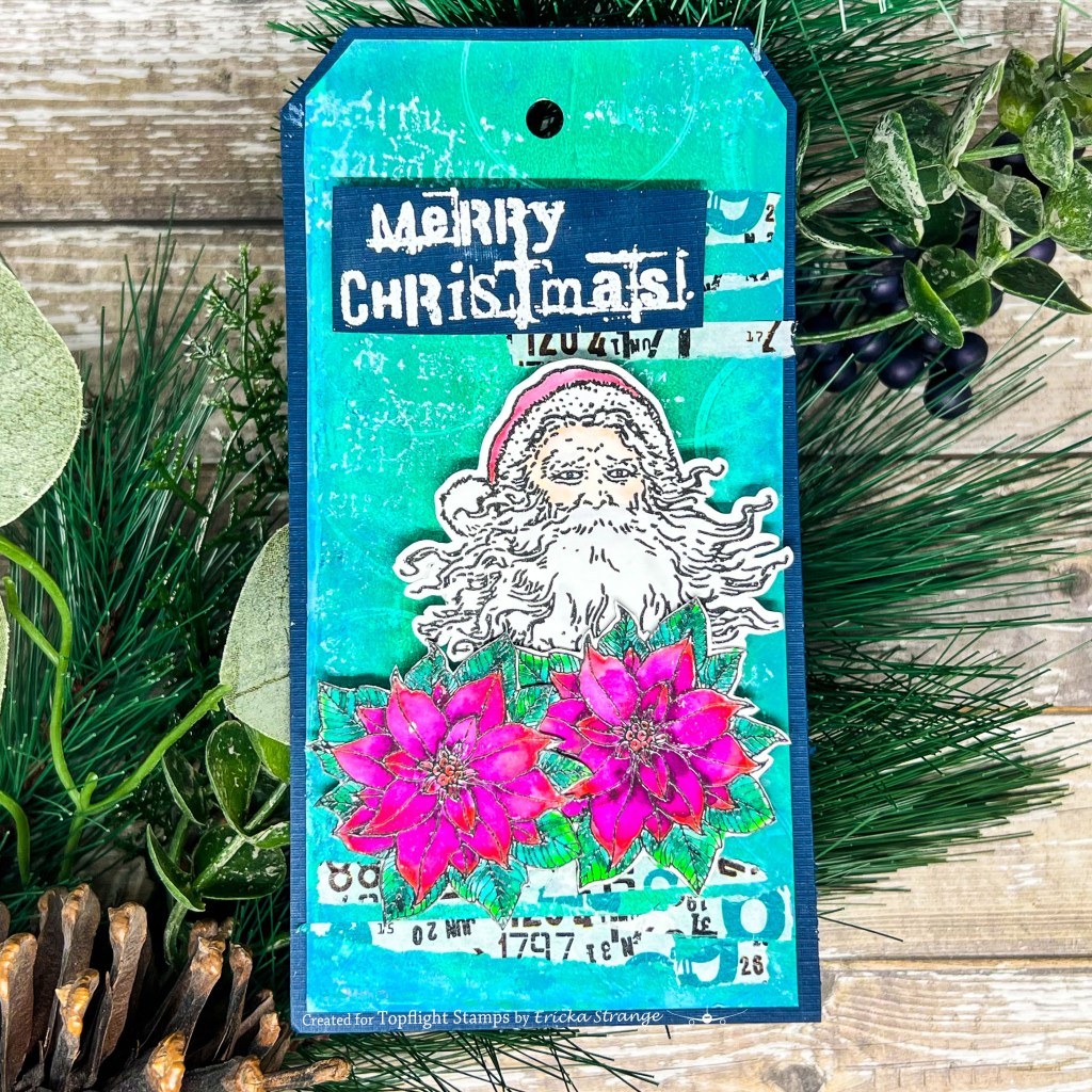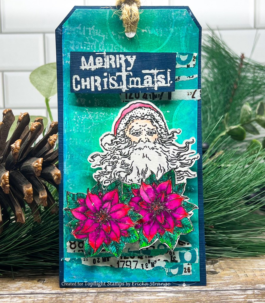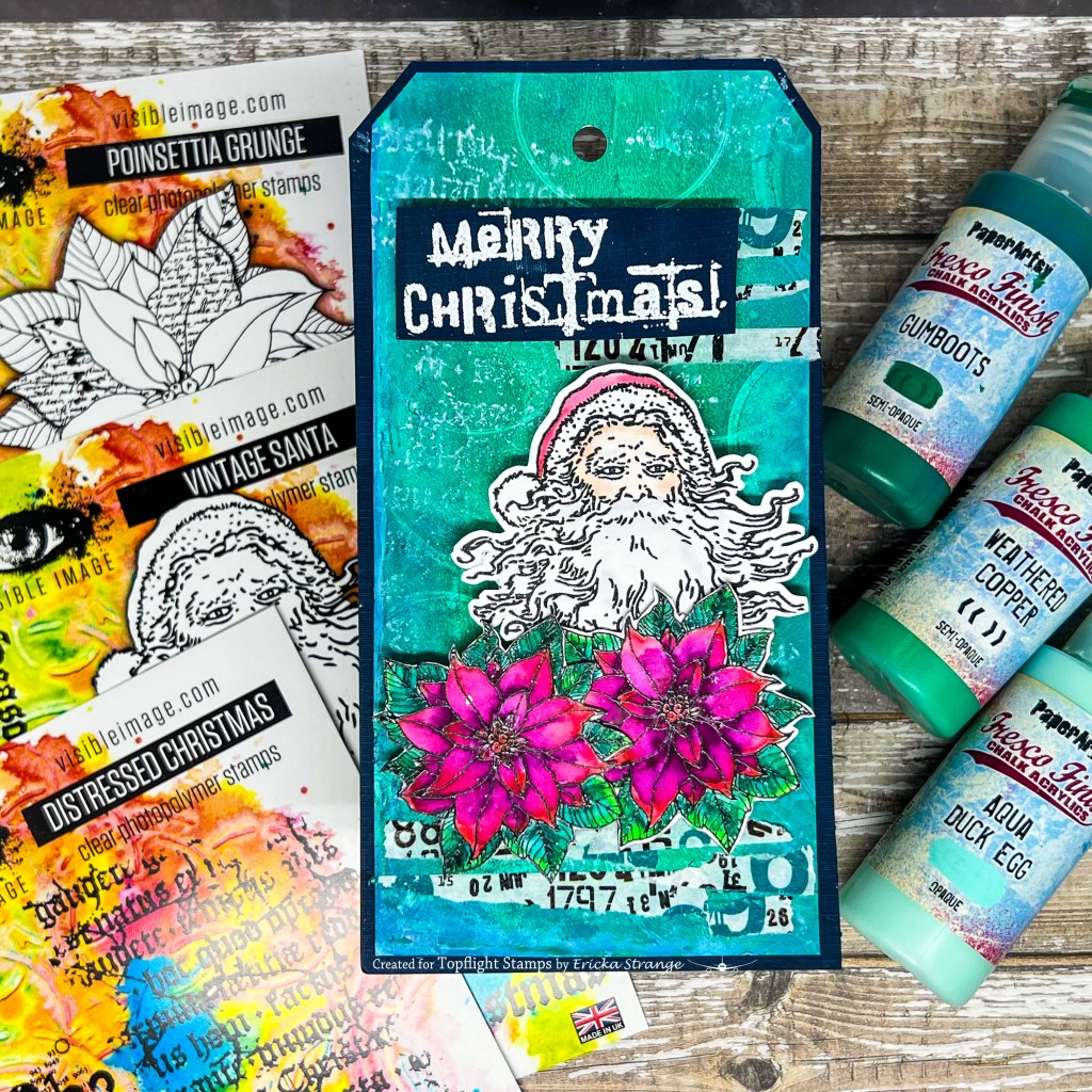 I then stamped the smaller images from the Visible Image Vintage Santa and Poinsettia Grunge and colored them up with some watercolor markers. I then stamped the Visible Image Distressed Christmas in white on the background of my tag.