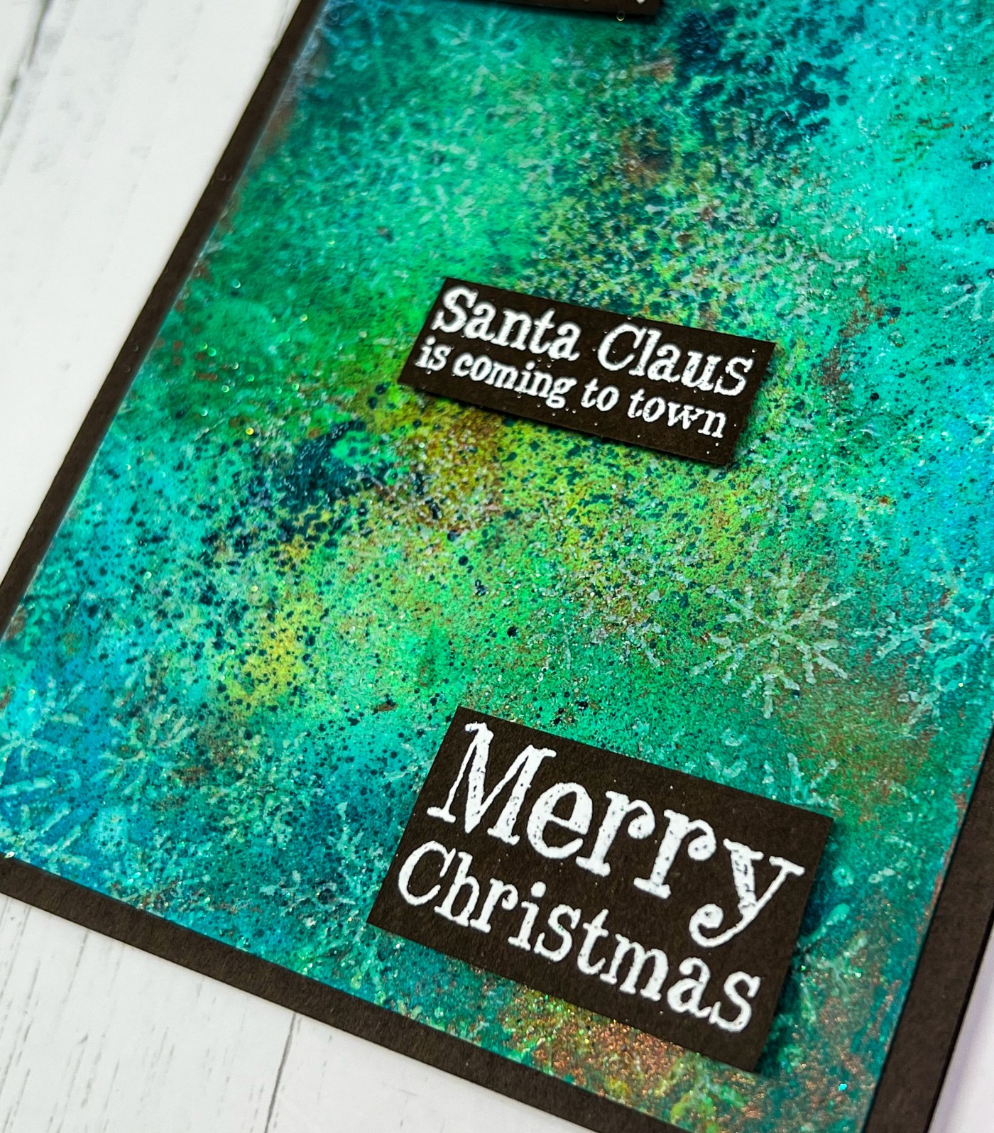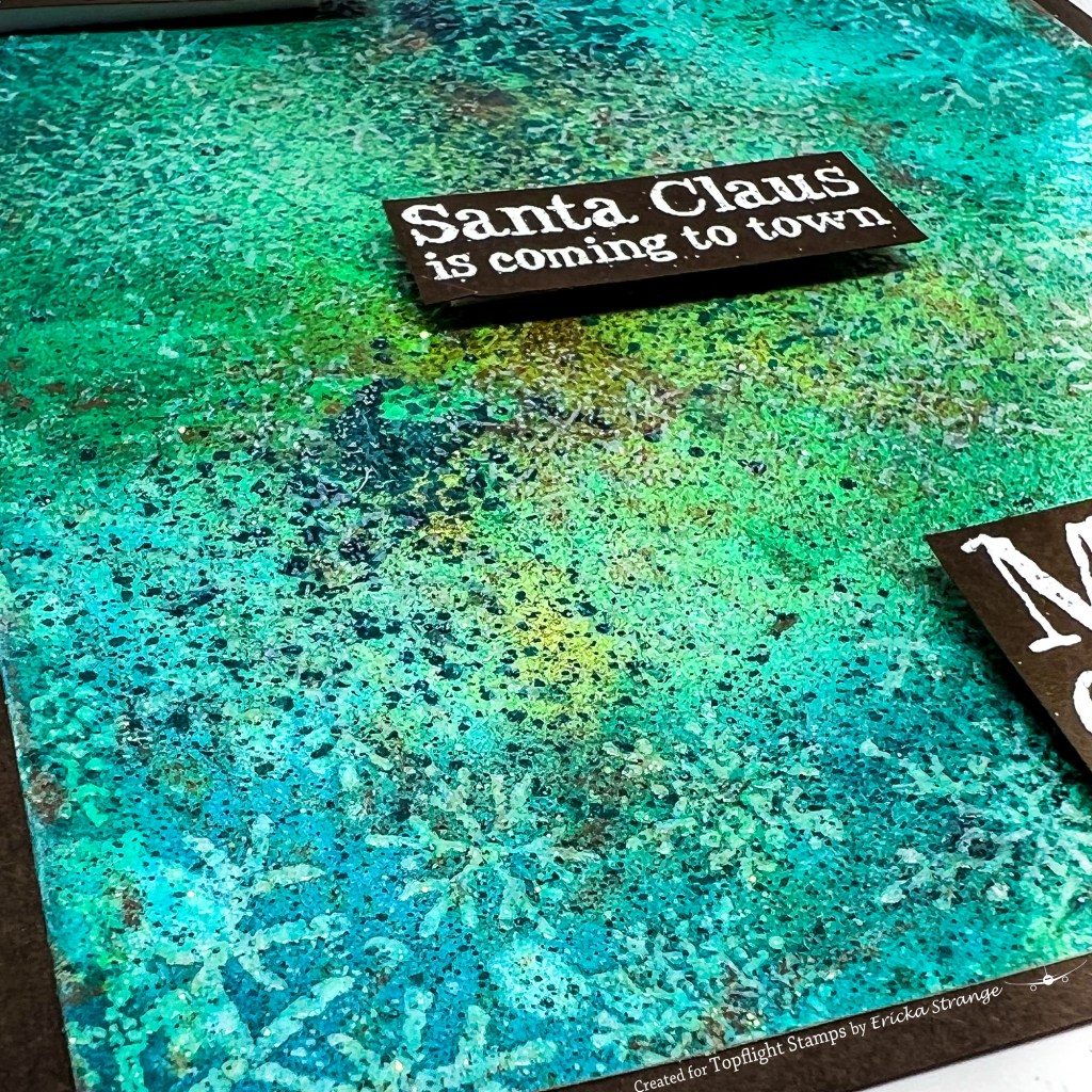 I added some blue ink blending around the edge and then stamped the Darkroom Door Merry Christmas strip and cut them into strips.