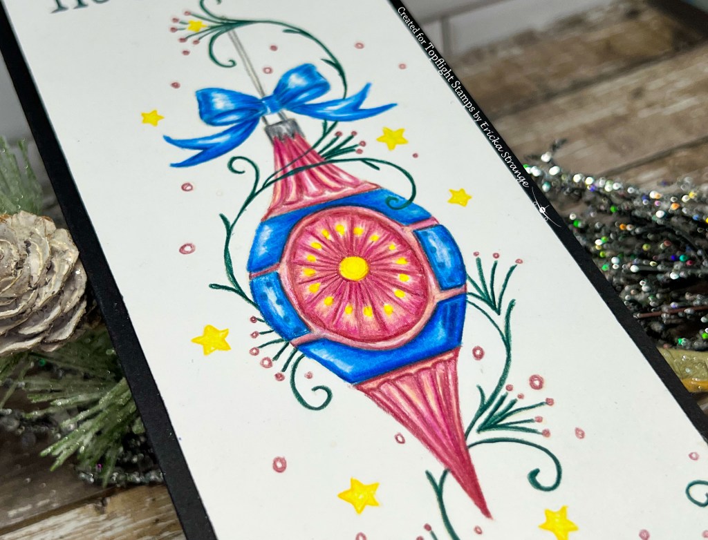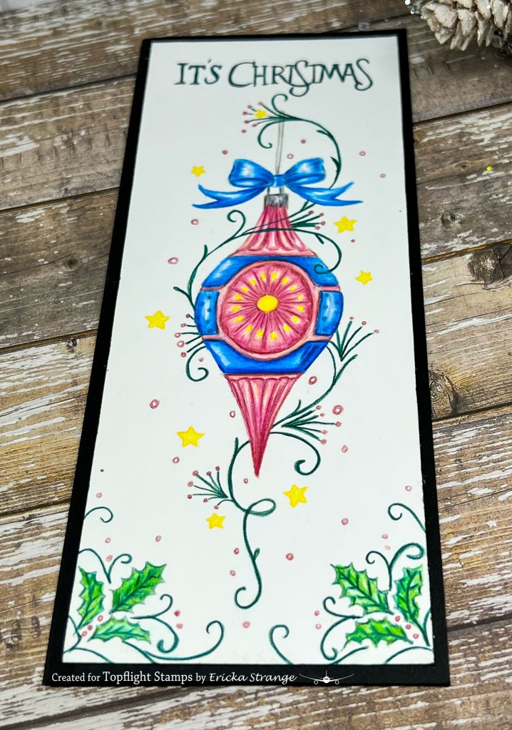 I started by stamping the Pink Ink Designs Bauble stamp on paper with Gina K Barely There ink so I could do some no-line coloring with my colored pencils. This is such a pretty and large Bauble that I made it into a slim line card in order to use all the details.