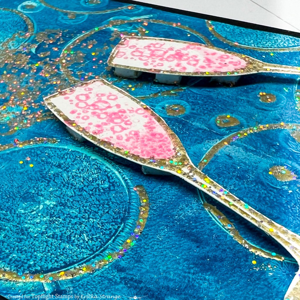 I fussy cut out the glasses and added bubbles to the glasses with Distress Oxide ink in Kitsch Flamingo. I then used my WOW! Embossing pen to trace around the circles on my background and add some more sparkly embossing powder. I added my glass to the background with foam tape.