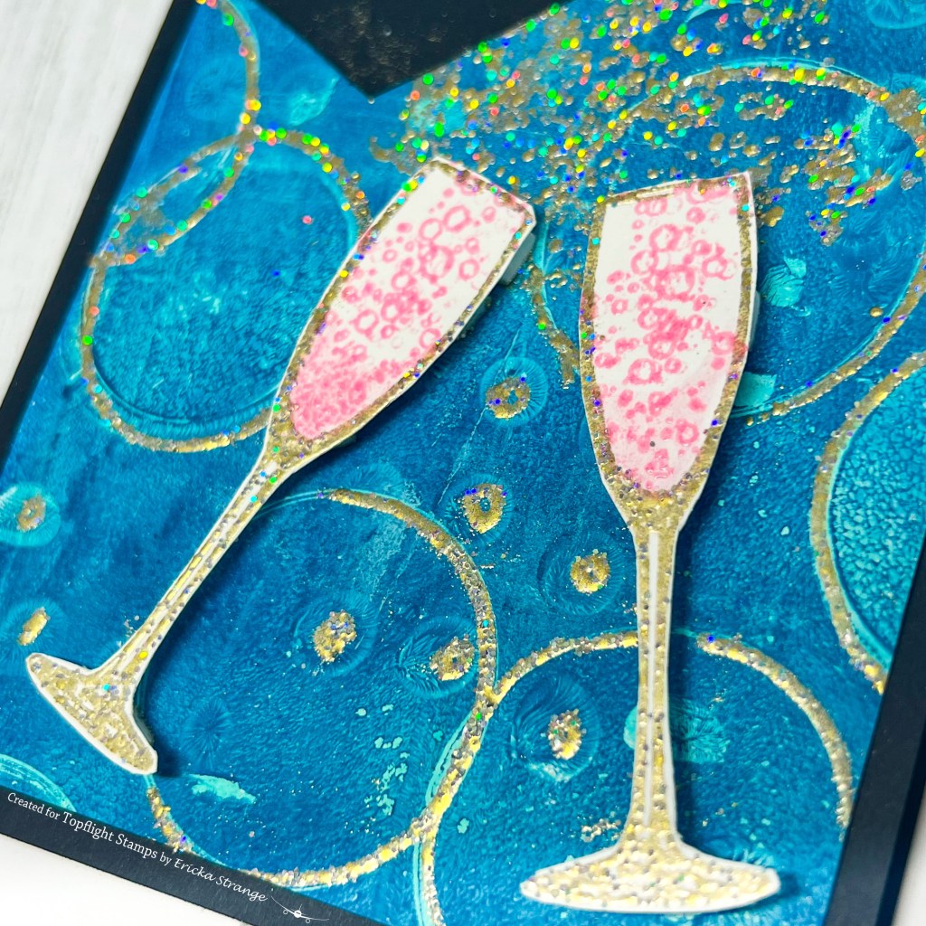 I started with a gel press print that I had created earlier using PaperArty Fresco Acrylics in Baltic Blue and Aquamarine. I created patterns on my gel press using things around the house like bottle tops. I stamped the champagne glasses and heat embossed them with some sparkly WOW! powder. After all, champagne, sparkles and New Years all go together, right?