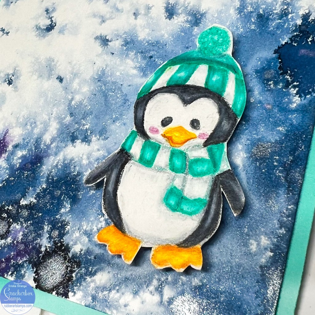 I did some no line coloring using some light ink to stamp the Penguin Hat stamp and color him up. I then fussy cut him out and put him aside while I made my background.