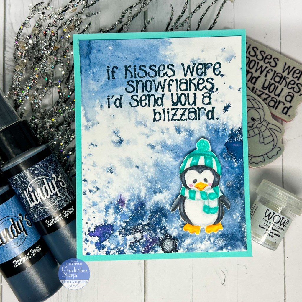 I used some Bristol Smooth paper and Lindy’s Starburst Spray in Penguin Play Periwinkle and Narwhal Navy. I love these fun sprays with sparkle and it was the perfect blizzard background.