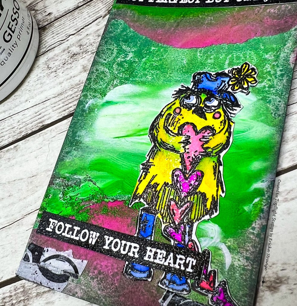Once my bird was dry, I fussy cut her out. I had a tag in my stash that I had made using my gel press and some texture paste I had added color to.Â