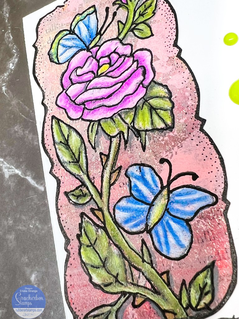 I started by stamping the Rose and Butterflies stamp on an old book page I had painted using my gel press. I colored in the image with some Posca pencils and then added the darker lines in with a black pen.