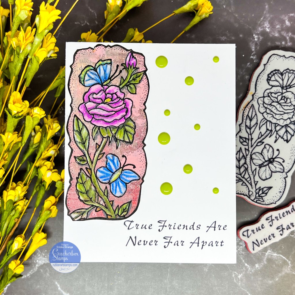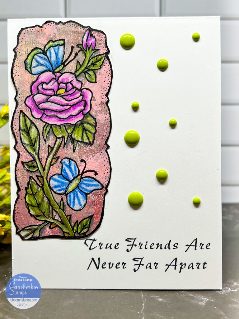 Hello crafty friends! Today I have a card I created for a friend using the Crackerbox Stamps Rose and Butterflies stamp. I also love the script of this True Friends Never Far sentiment which lends to a vintage feel for my card.