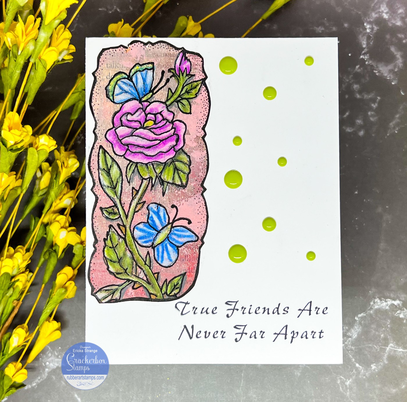 Hello crafty friends! Today I have a card I created for a friend using the Crackerbox Stamps Rose and Butterflies stamp. I also love the script of this True Friends Never Far sentiment which lends to a vintage feel for my card.