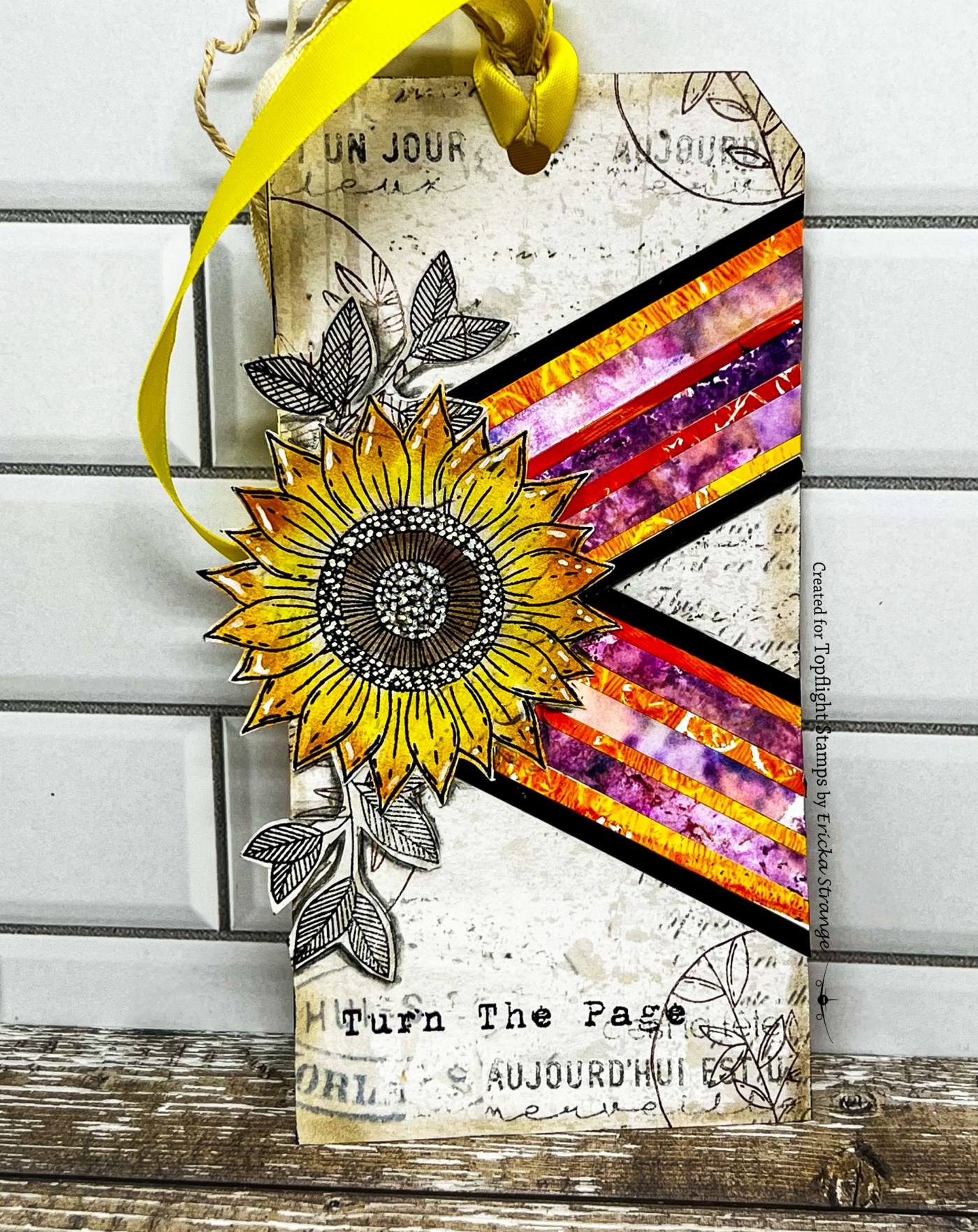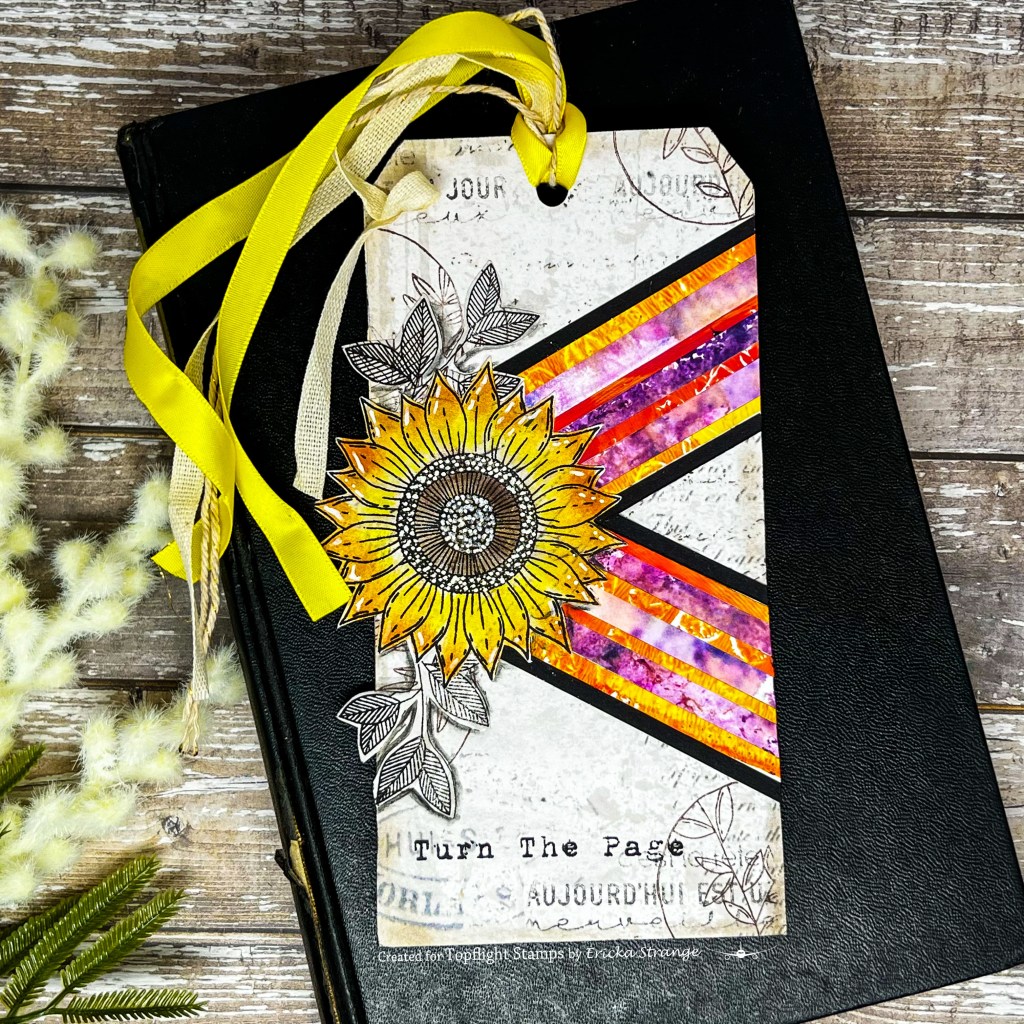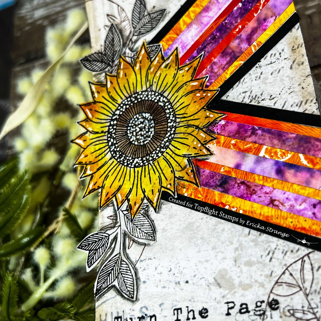 I stamped the sentiment several time around the tag and then found the “Turn the Page” sentiment in the AALL & Create Bring on the Sentiments set. I used a white gel pen to add some little details to my sunflower and finished my tag with some light ink blending with Lavinia Truffle Ink.