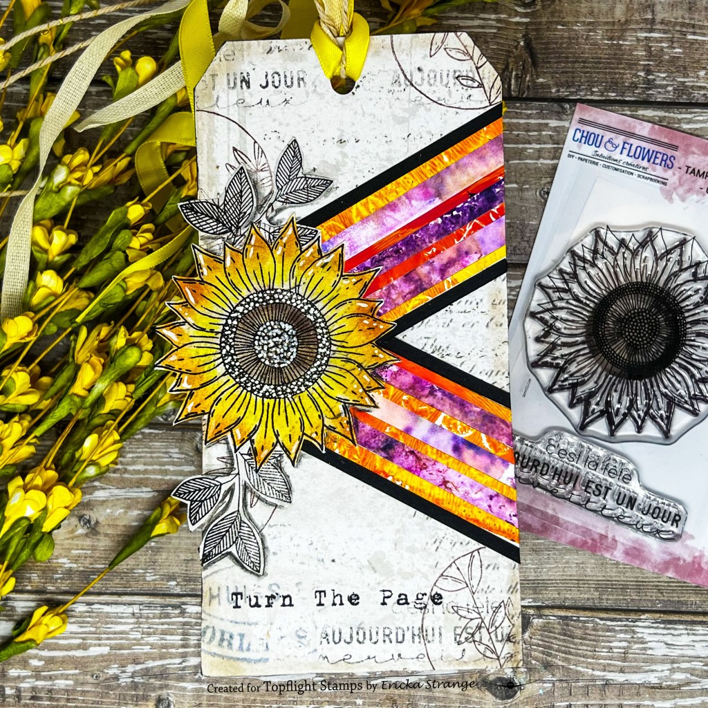Hello friends! Today I am playing with this beautiful Sunflower from Chou & Flowers. I don’t know about you but my desk always has a pile of scrap papers from previous projects that are just too pretty to throw out. So today, I decided to conquer some of my pile and use my paper left overs to create a tag.