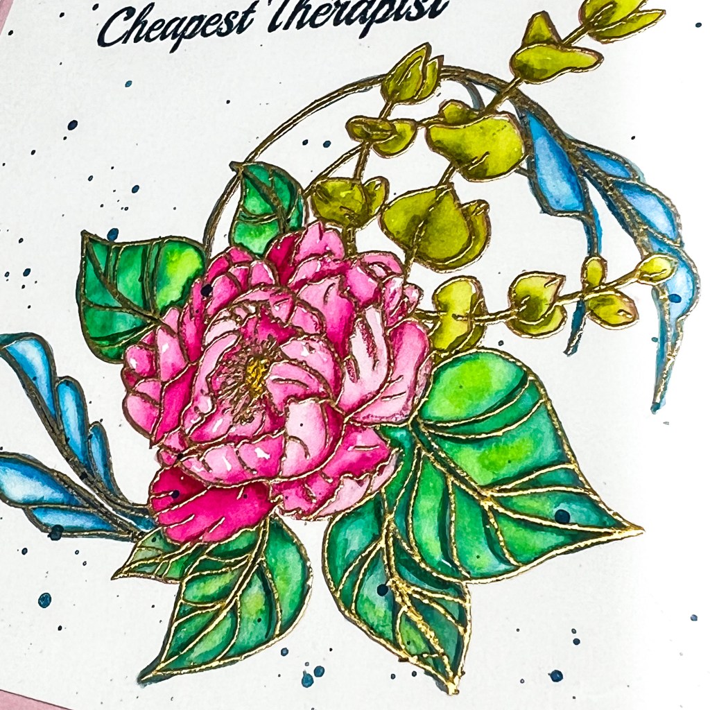 Hello friends. Today I have a card I made with the Crackerbox Stamp New Release. I love the pretty Violeta and Eucalyptus stamp and watercolored it up and then heat embossed it in gold.
