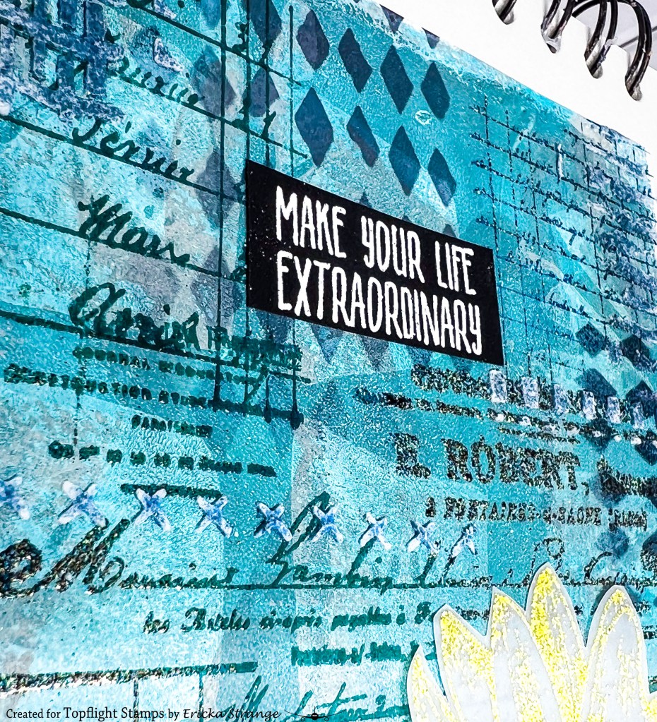 I used the Darkroom Door Handwritten Ledgers and stamped the images with Versafine Clair inks in Nocturn, Warm Breeze, and Twilight. I then used some WOW! Embossing powders ti add some sparkle and shine to my ledgers. I added additional texture on my background using the Darkroom Door Diamonds and Grunge Border stencils.