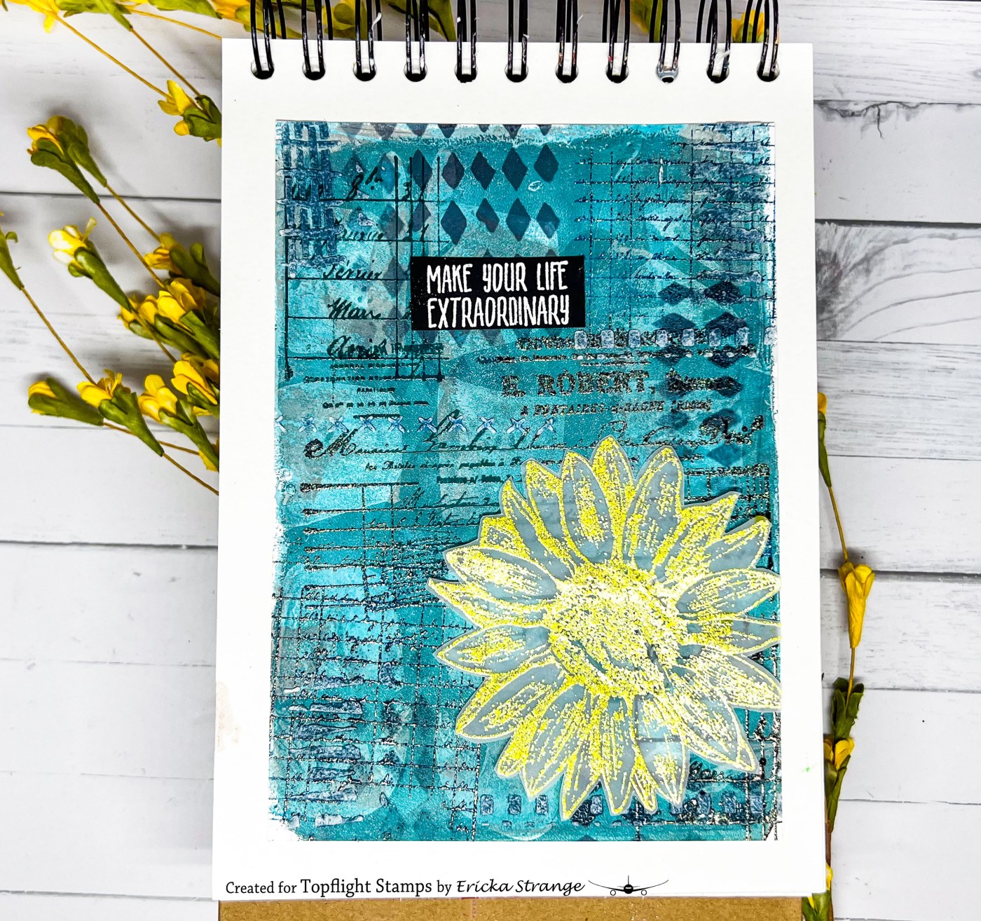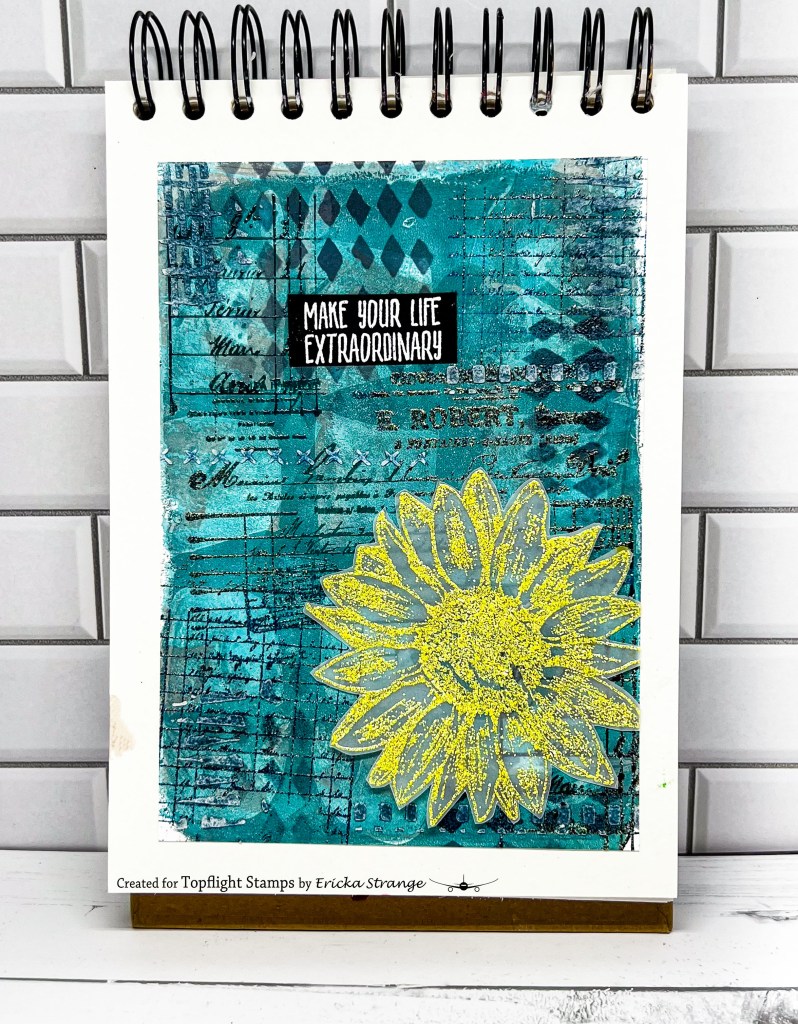 I added the Darkroom Door Flower from the Sunflowers set that I heat embossed with yellow embossing powder on vellum and fussy cut out. I finished my page with a white heat embossed sentiment from the Darkroom Door Dream Big sentiment strip.