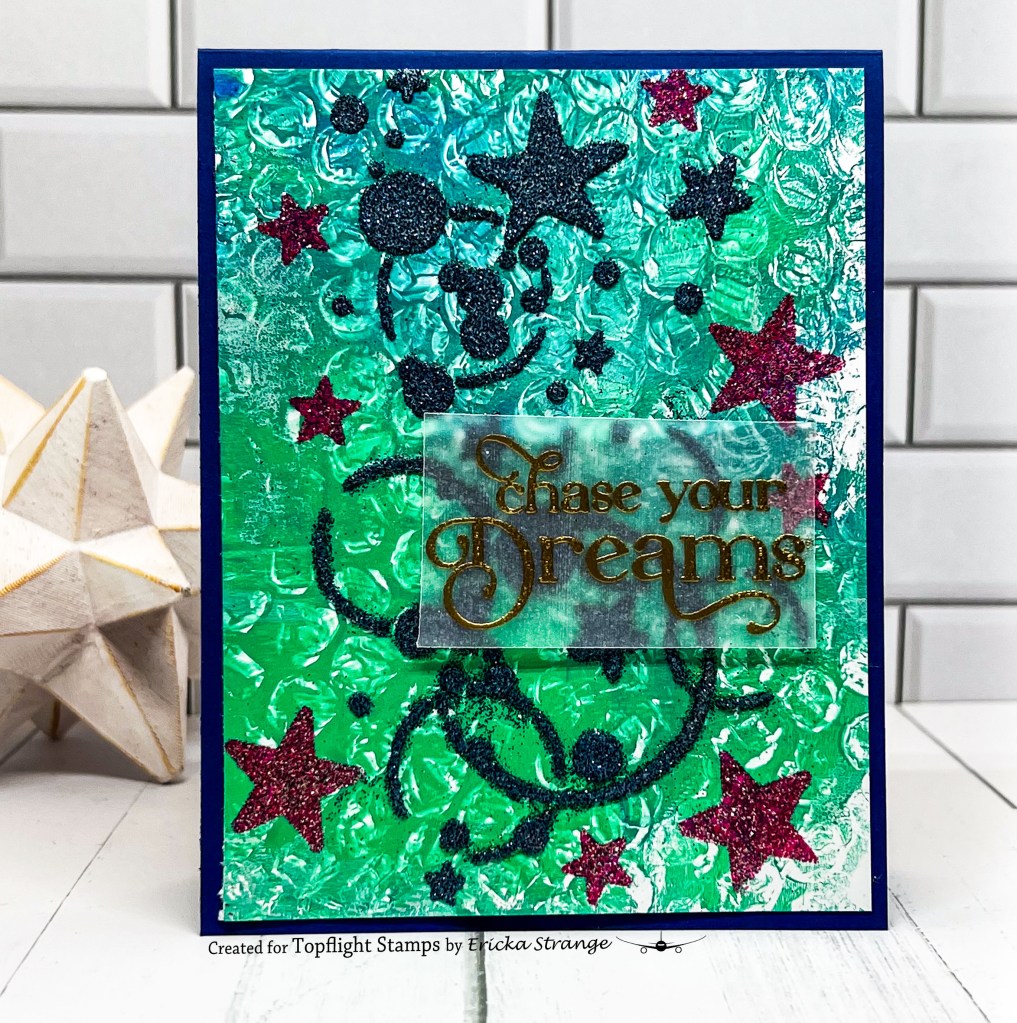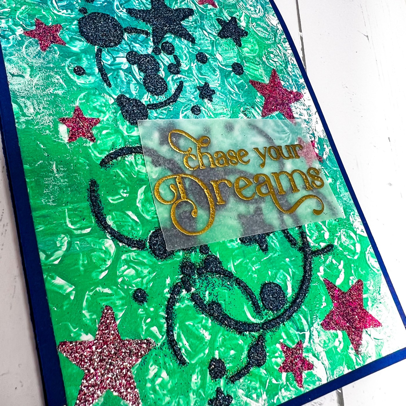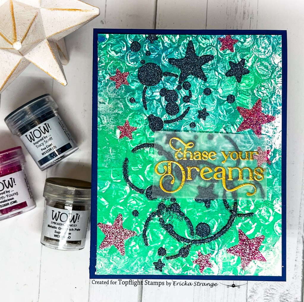I took embossing paste with the Visible Image Seeing Stars stencil and then sprinkled WOW! Embossing Pea Coat powder on the wet embossing paste.