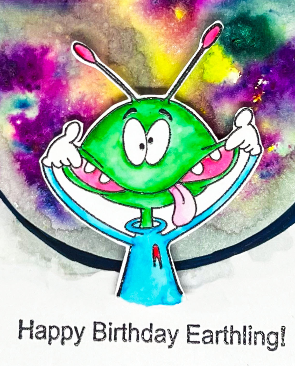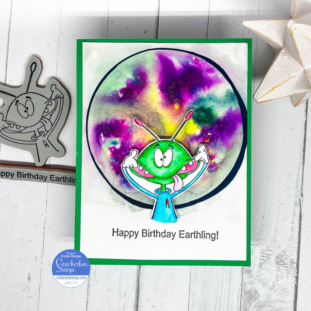 Hello friends today I have a fun birthday card using the Crackerbox Stamps Alien Funny Face along with this perfect Happy Birthday Earthling sentiment.
