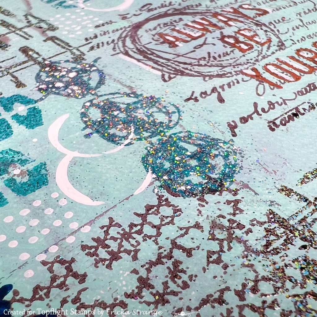 I then used Versafine Clair inks in Pine Cone, Twilight, and Warm Breeze and stamped the various stamps included in the set. I also used some WOW! Embossing powders to add texture to my page.