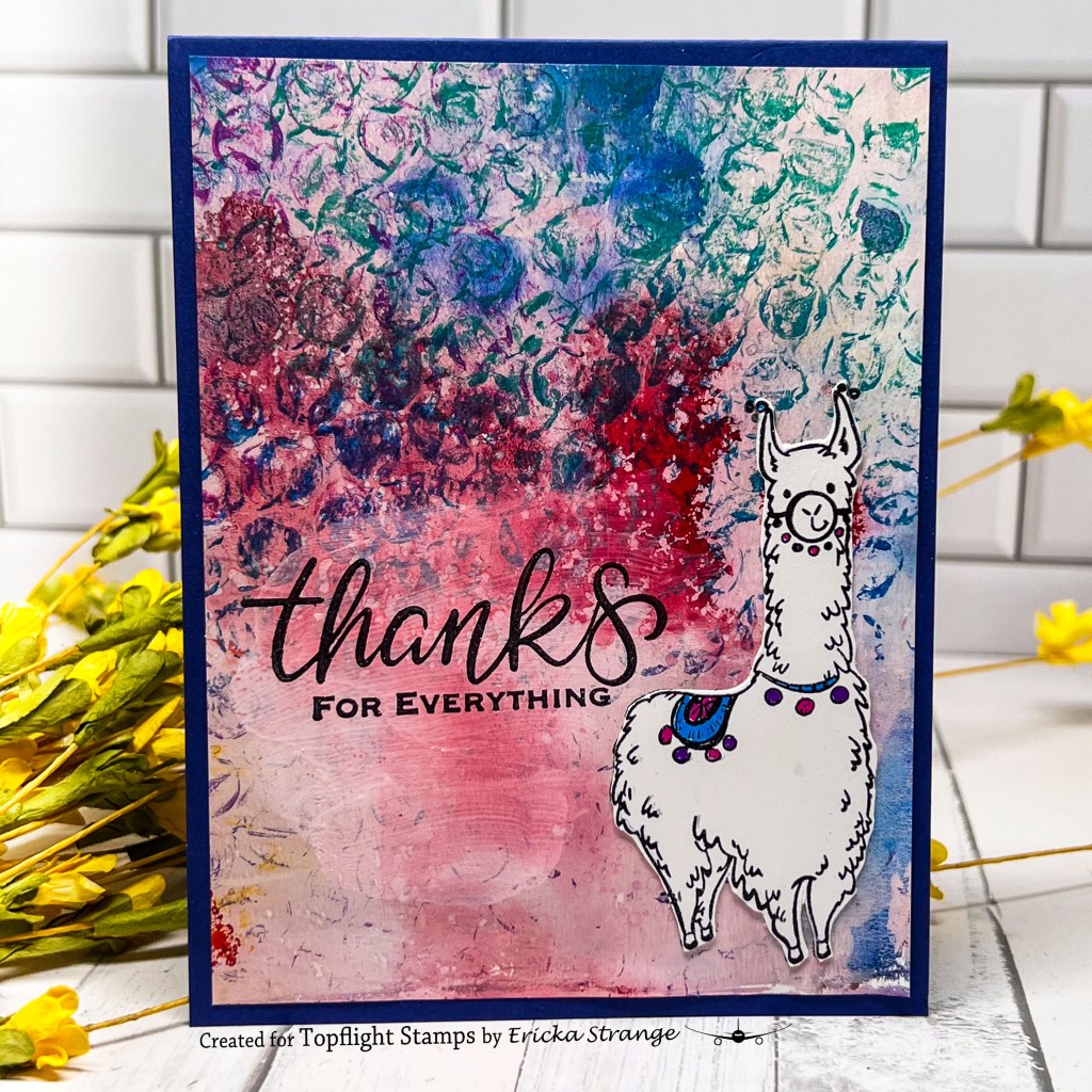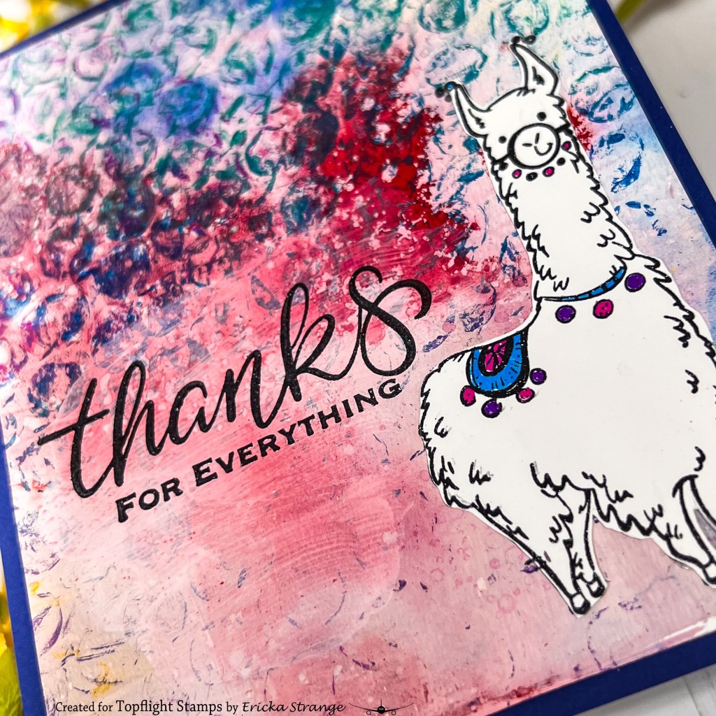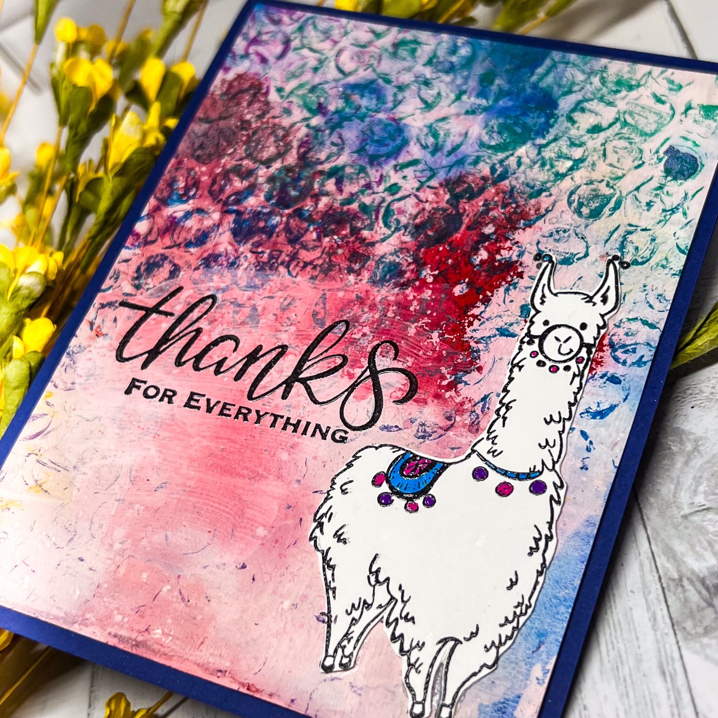 Hello crafty friends! Today I have a fun mixed media card using my gel press and the Katzelkraft Llamas. School is starting up, and as a teacher I can always use thank you cards.