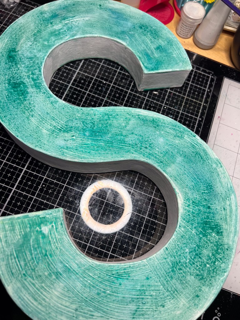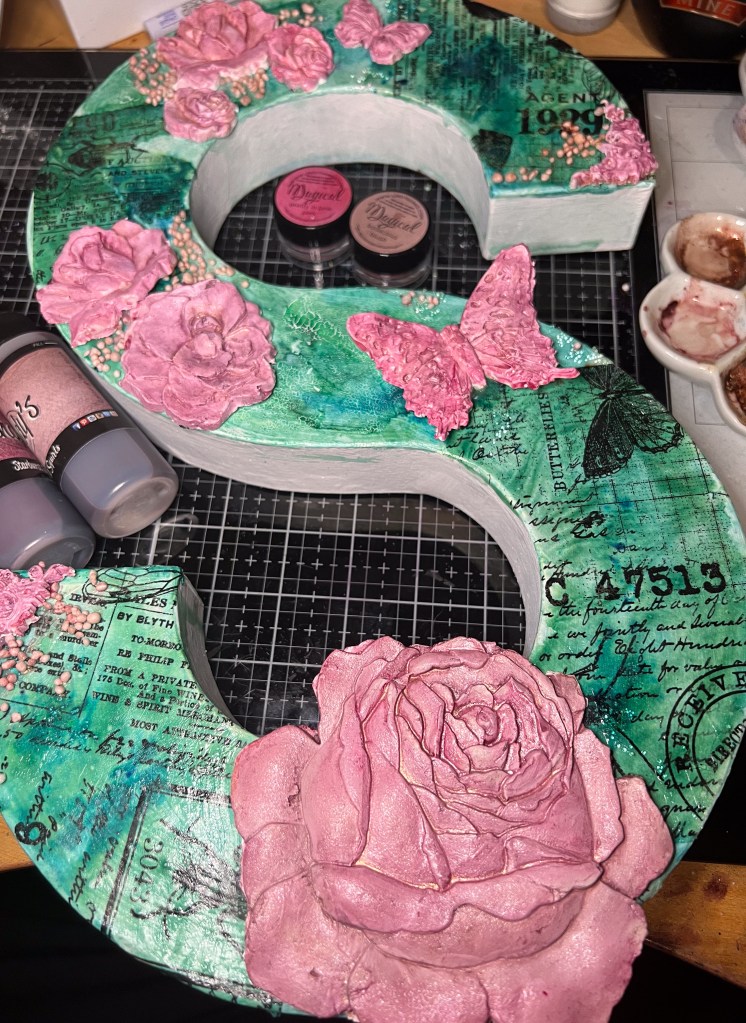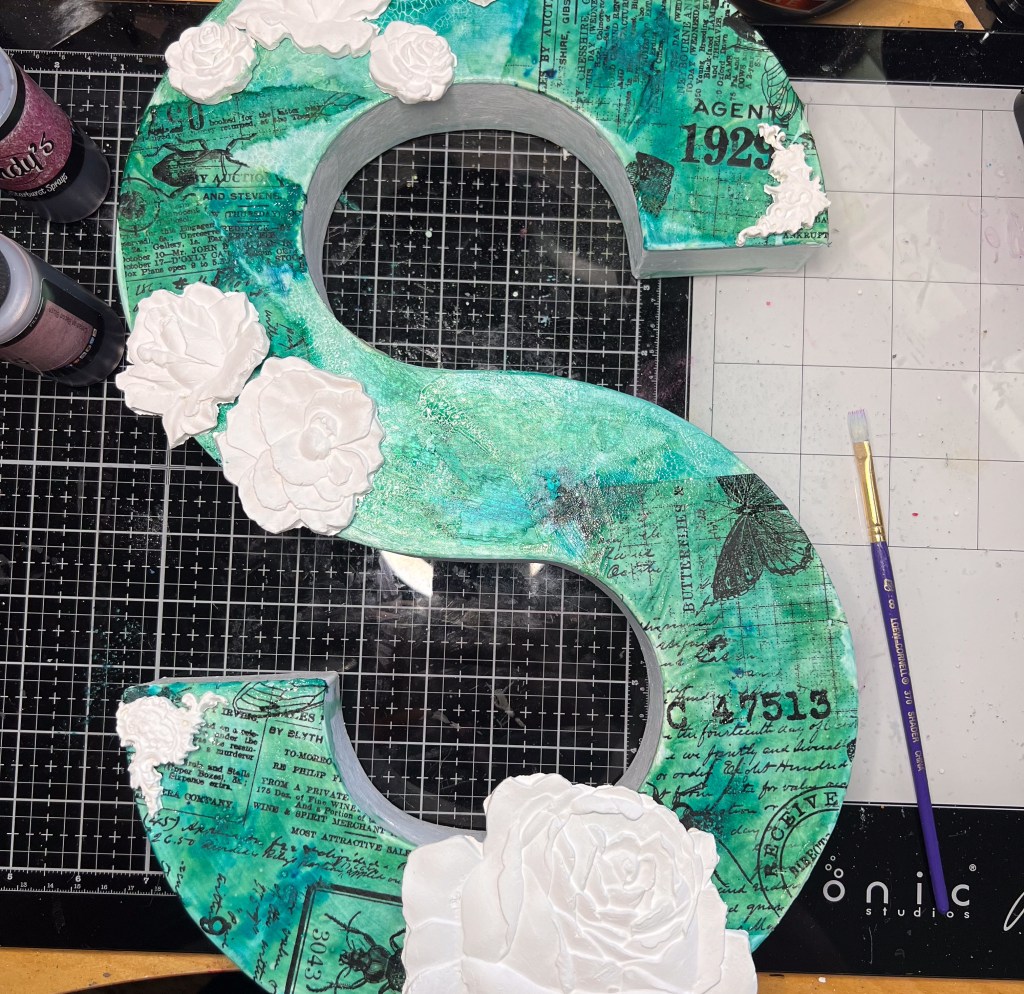 I had bought this large S awhile back and had painted it with white gesso and then was stuck. So when this challenge came up I thought it would be the perfect time to try some new techniques.