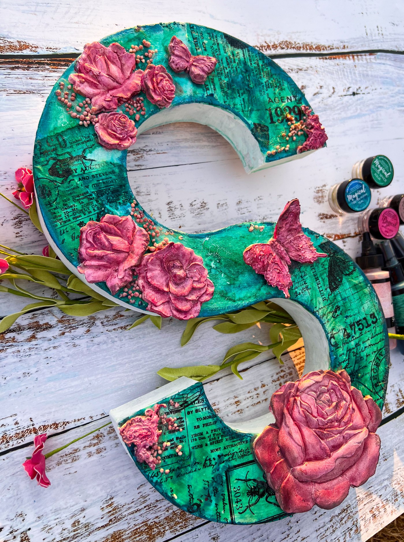 I had bought this large S awhile back and had painted it with white gesso and then was stuck. So when this challenge came up I thought it would be the perfect time to try some new techniques.