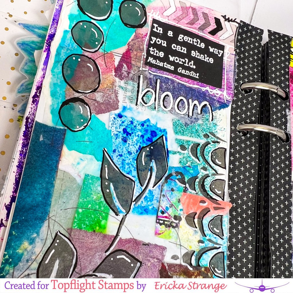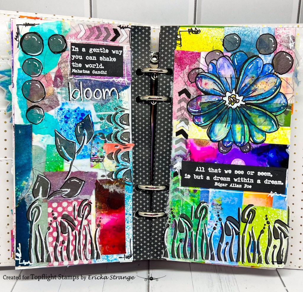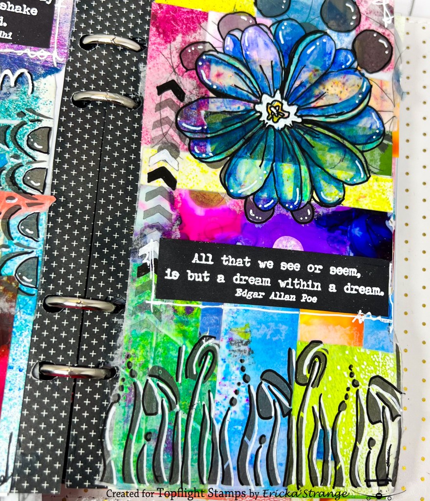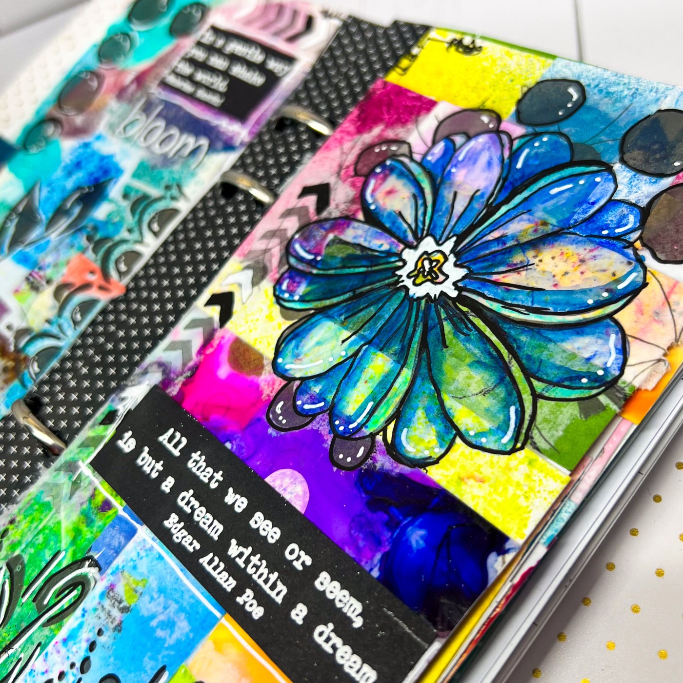 Once my page was dry, I used some watercolor crayons to color in the flower. I then used my white and black Posca pens to highlight portions of the tissue images.