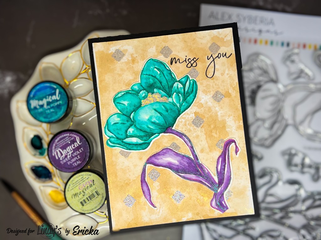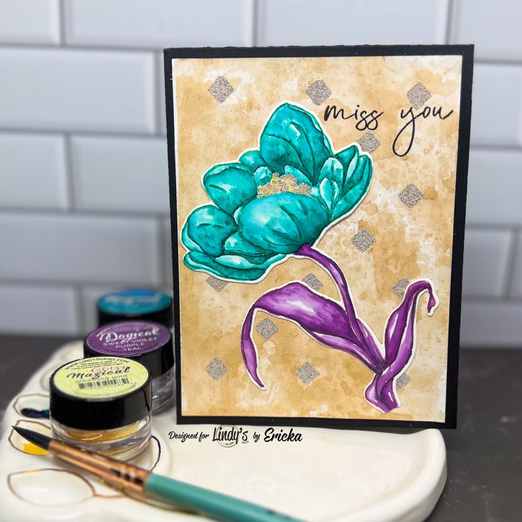I stamped the tulip in Antique Linen Distress Ink on watercolor paper and then painted it with Lindy’s Magicals in Tibeten Poppy Teal, Sweet Violet Purple Teal, and Gleaming Gold.