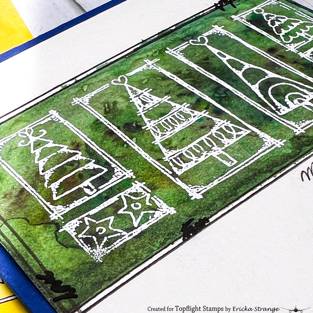 Once it was dry, I stamped the Oh Christmas Tree stamp and white heat embossed it. I added a frame around it with a black pen and then hand wrote “Merry Christmas.”