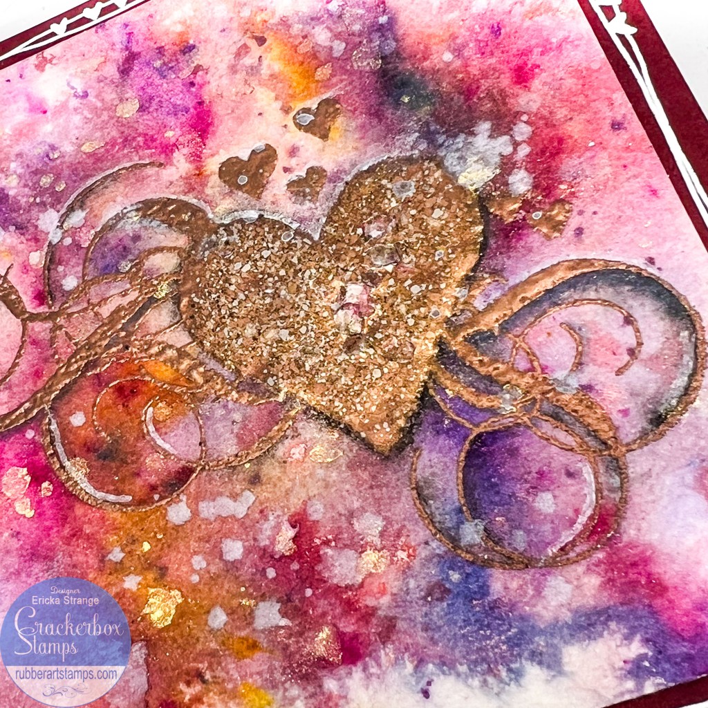 I created a watercolor background using Lindy’s Magical Shakers on watercolor paper. After my background was dry, I used the Swirly Hearts stamp and embossed it with the Lindy’s Cowabunga Copper and added a second coat of That’s Marbe-lous Chunky embossing powder on the large heart.