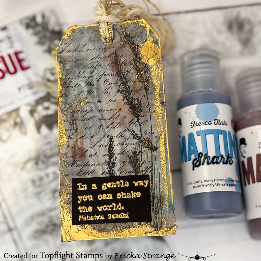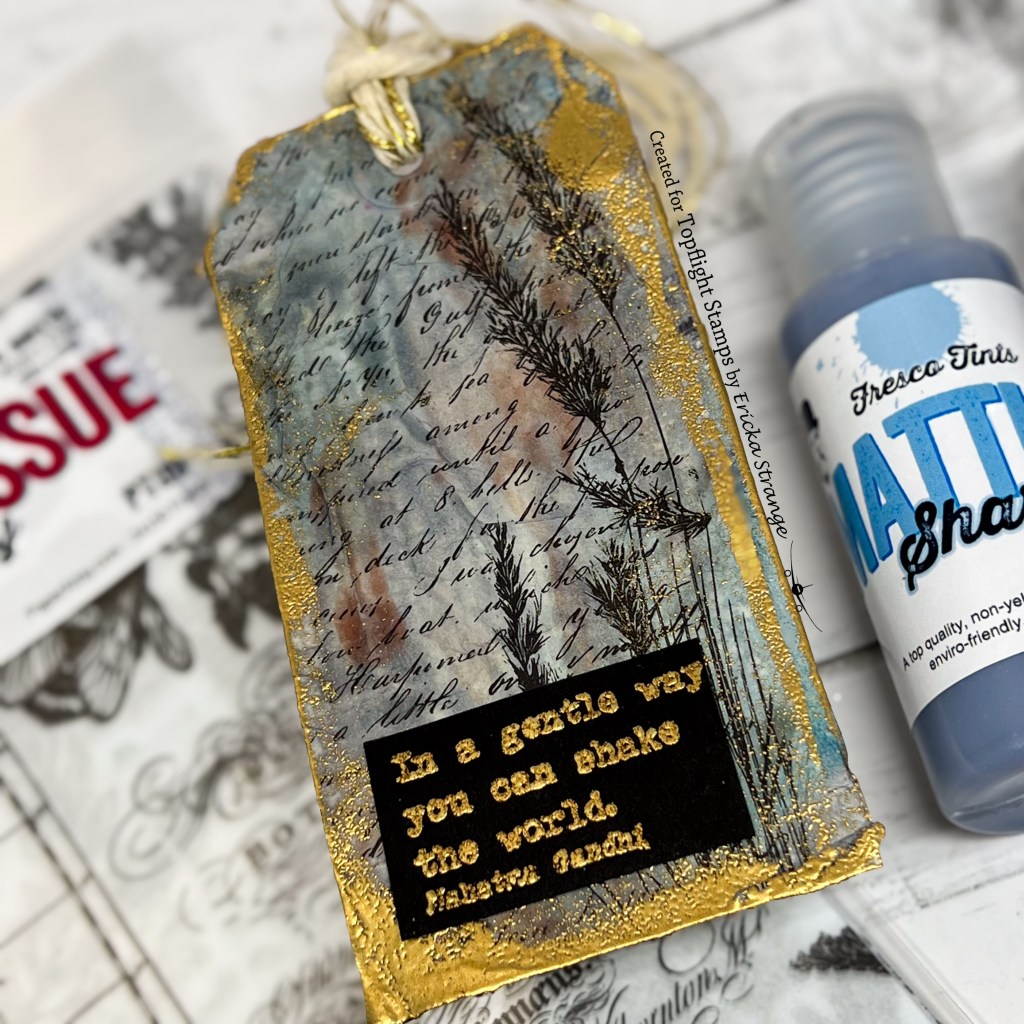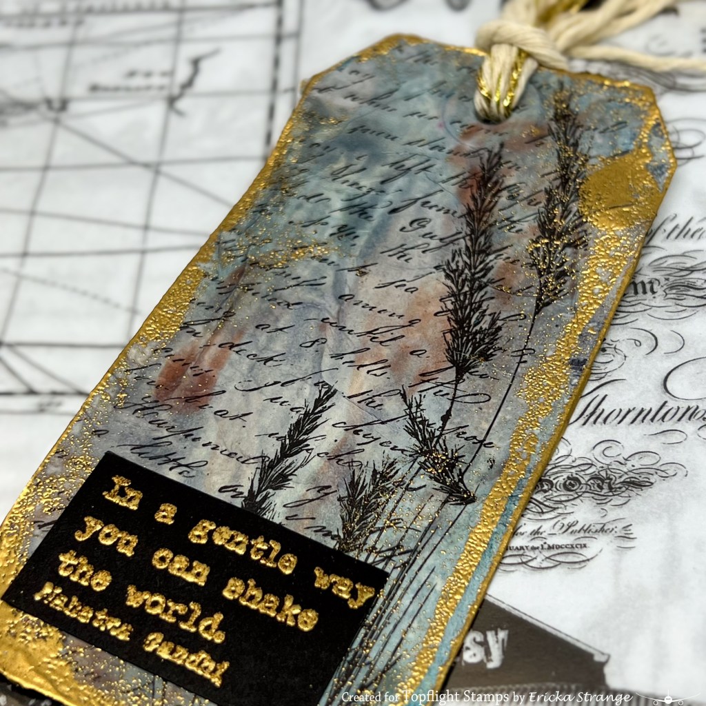 Once it was dry, I applied a layer of the Mattints to the other side of the paper and applied it to my tag and smoothed it on. When that layer was dry, I added some embossing ink and gold embossed the edge of my tag.