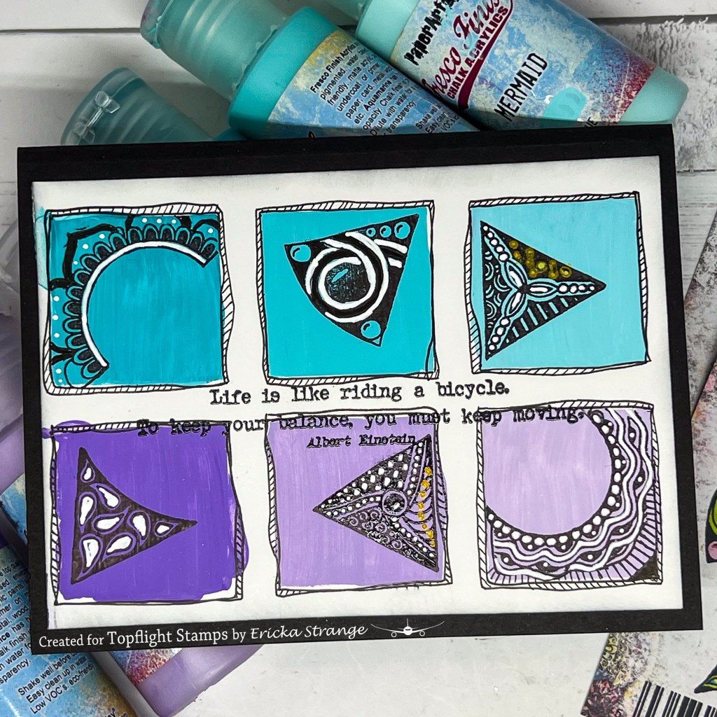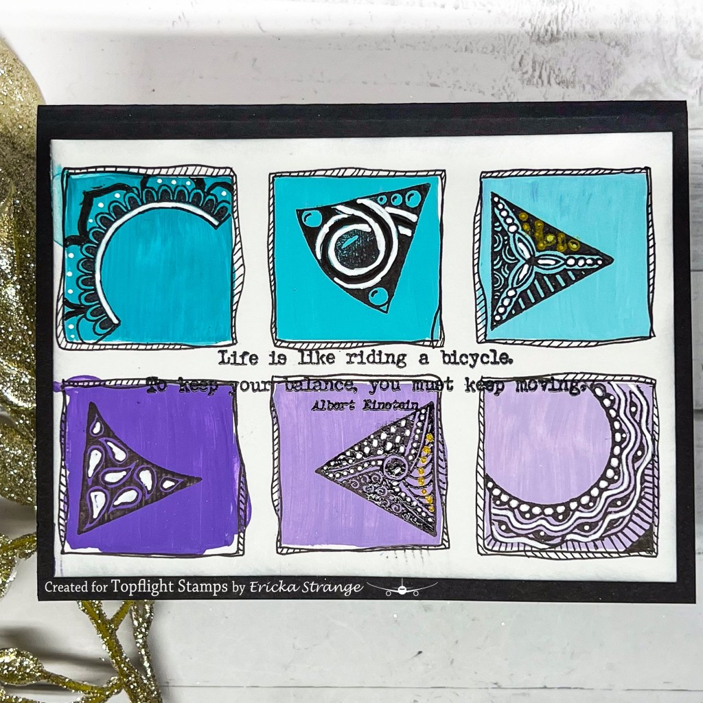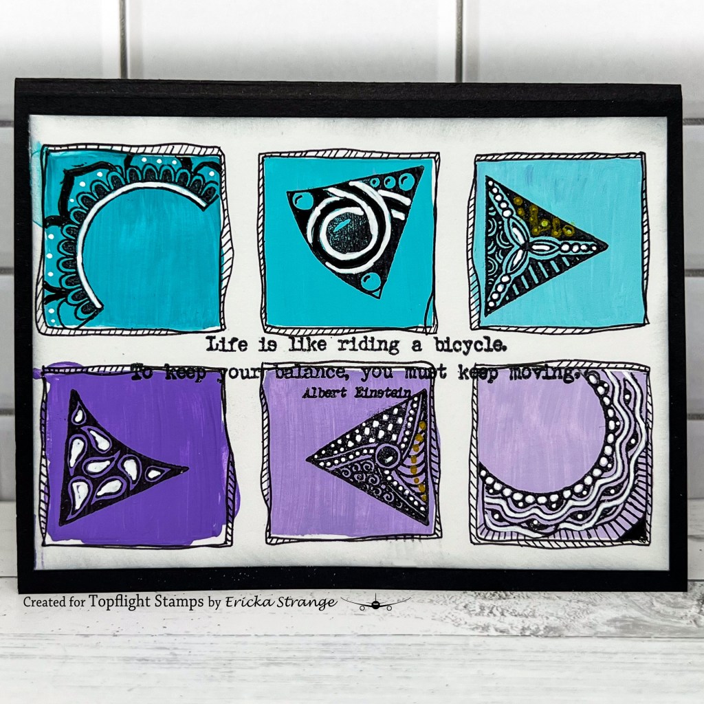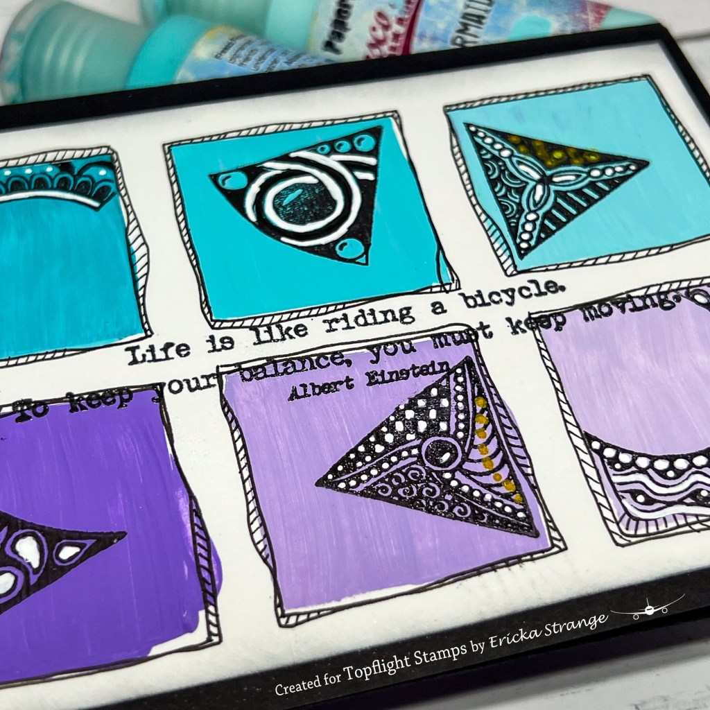 Once my background was dry, I used the Tracy Scott Mini 09 & 13 stamps and added an image into each square. I added some white and black pen details along with a little gold for fun.
